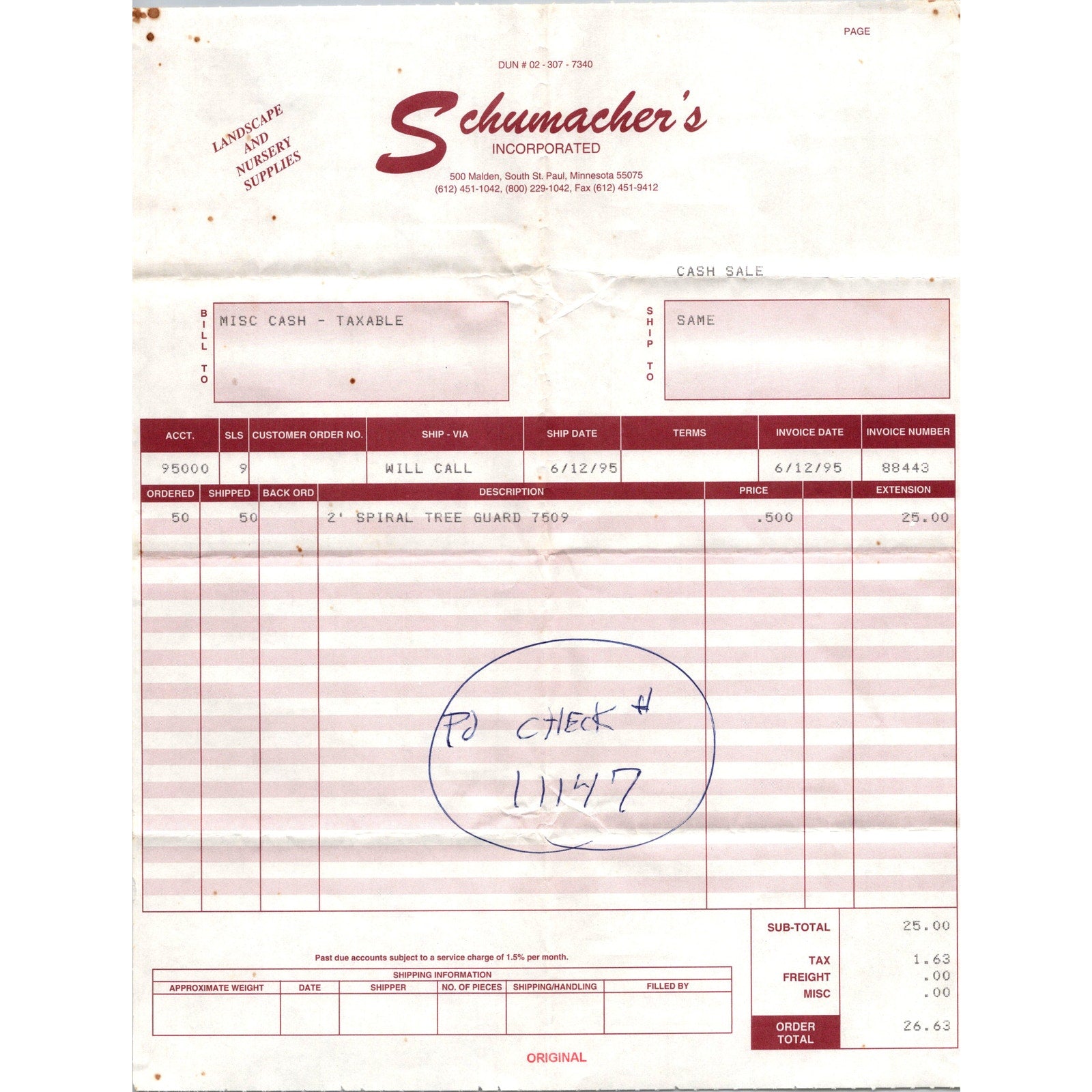 Schumacher's Incorporated Landscape Nursery South St. Paul MN 1995 Billhead K22