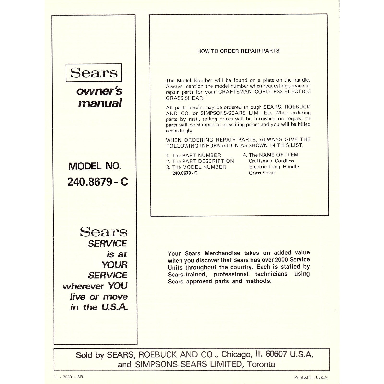 Sears Craftsman Cordless Electric Grass Shear Model 240.8679-C Manual AG5-1