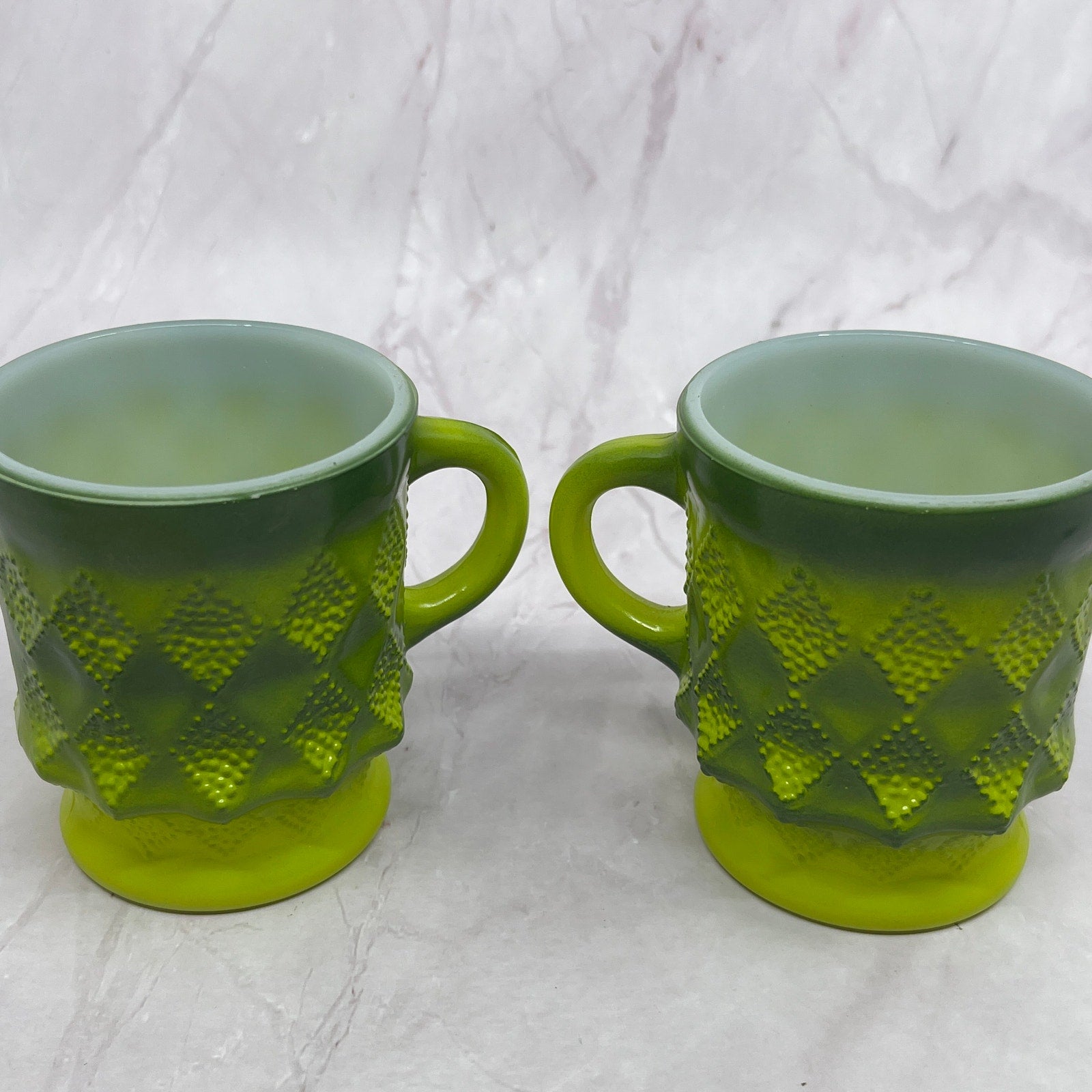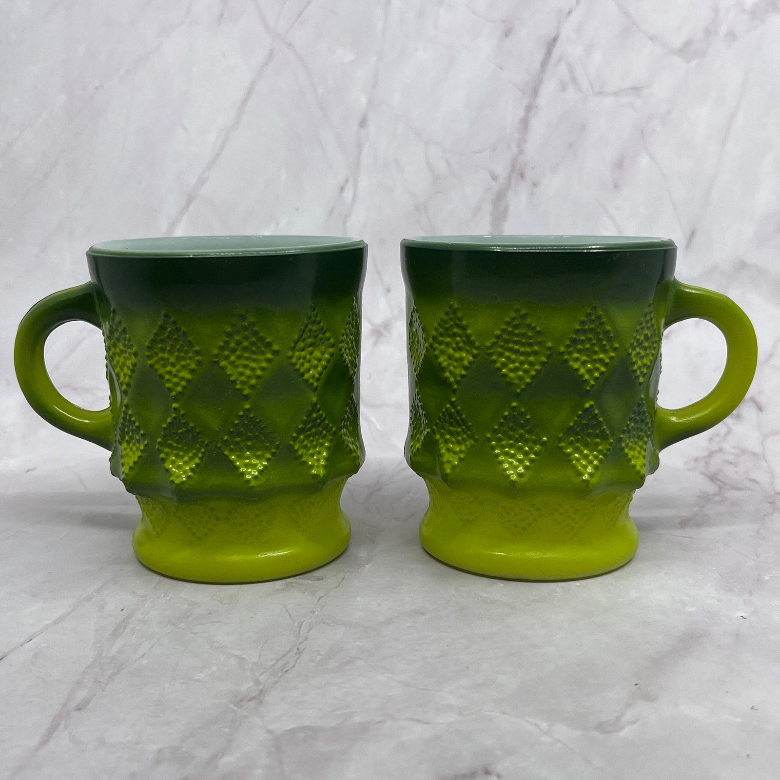 Set of 2 Retro Fire King Ombre Green Kimberly Diamond Milk Glass Mugs Cups TC5