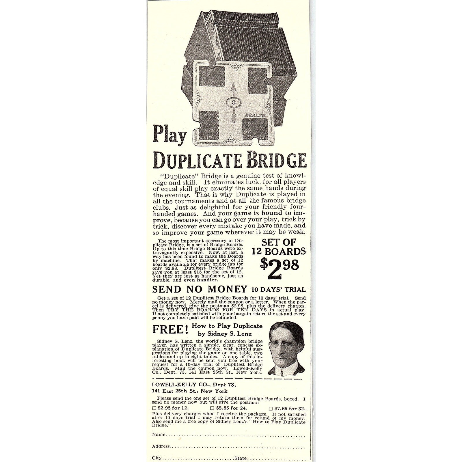 Sidney S. Lenz - Learn Duplicate Bridge Lowell-Kelly Co NY 1926 Ad AG3-7