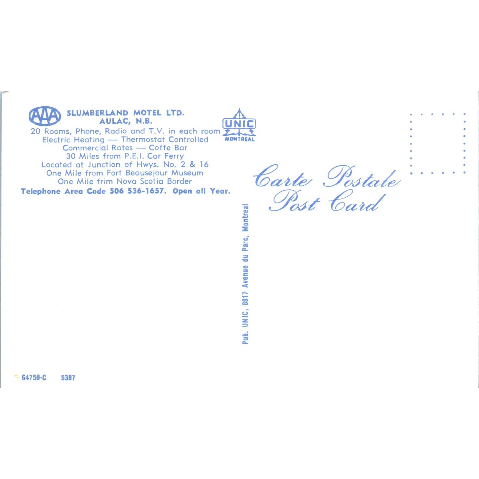 Slumberland Motel Ltd Aulac N.B. Canada - Original Postcard TJ7-RP2
