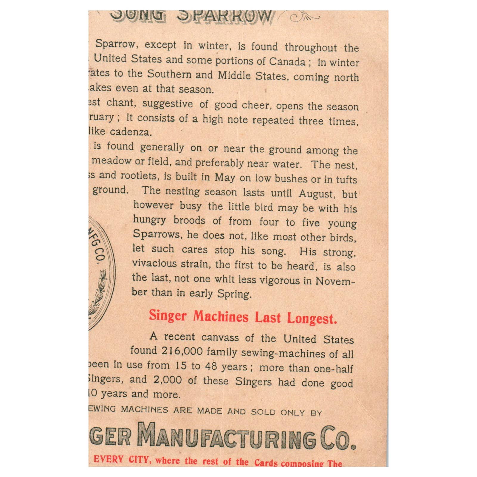 Song Sparrow Singer Sewing Machines Trimmed - 1880s Victorian Trade Card TJ8-3