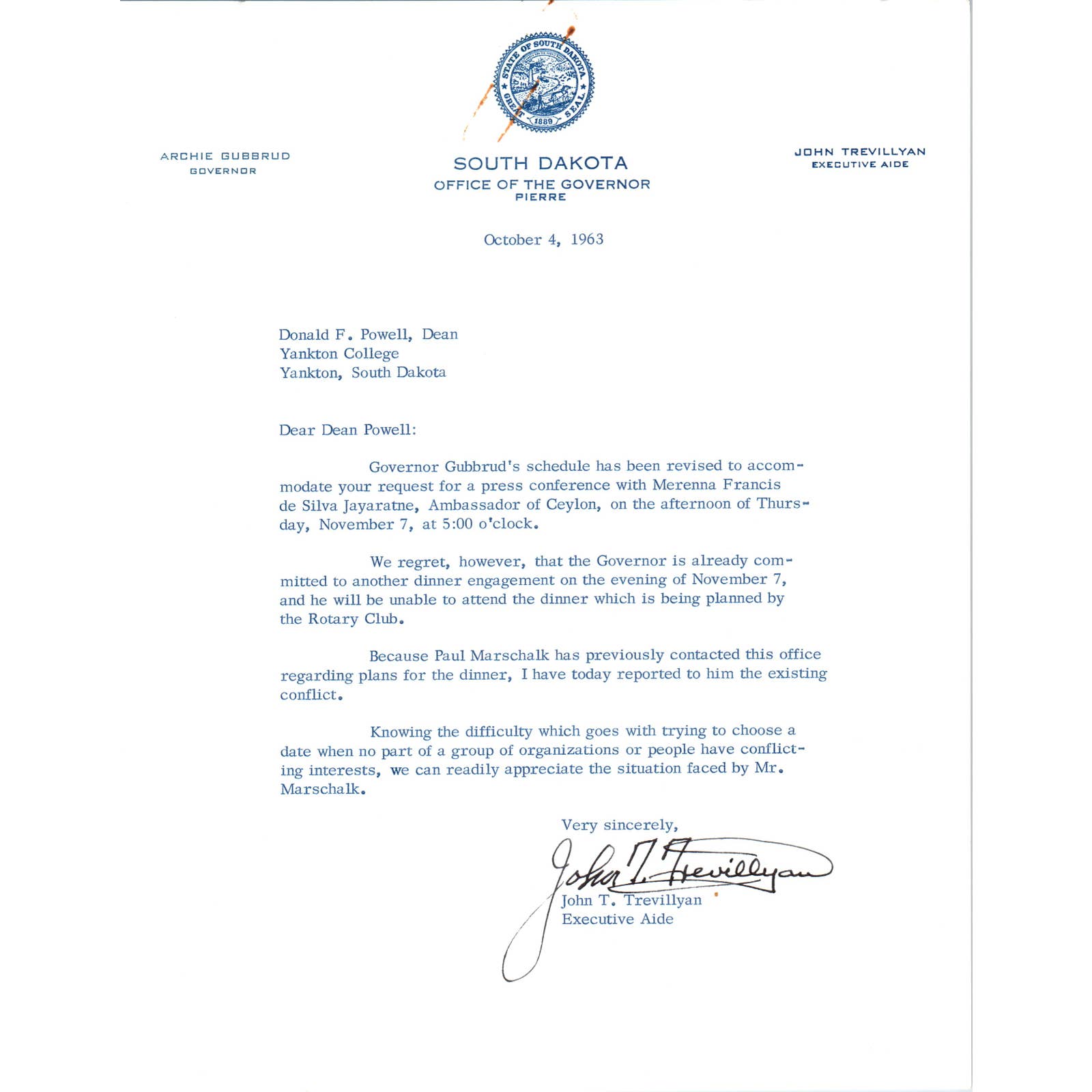 South Dakota Governor Archie Gubbrud Letterhead Memo Oct 4, 1963 TK1-P4