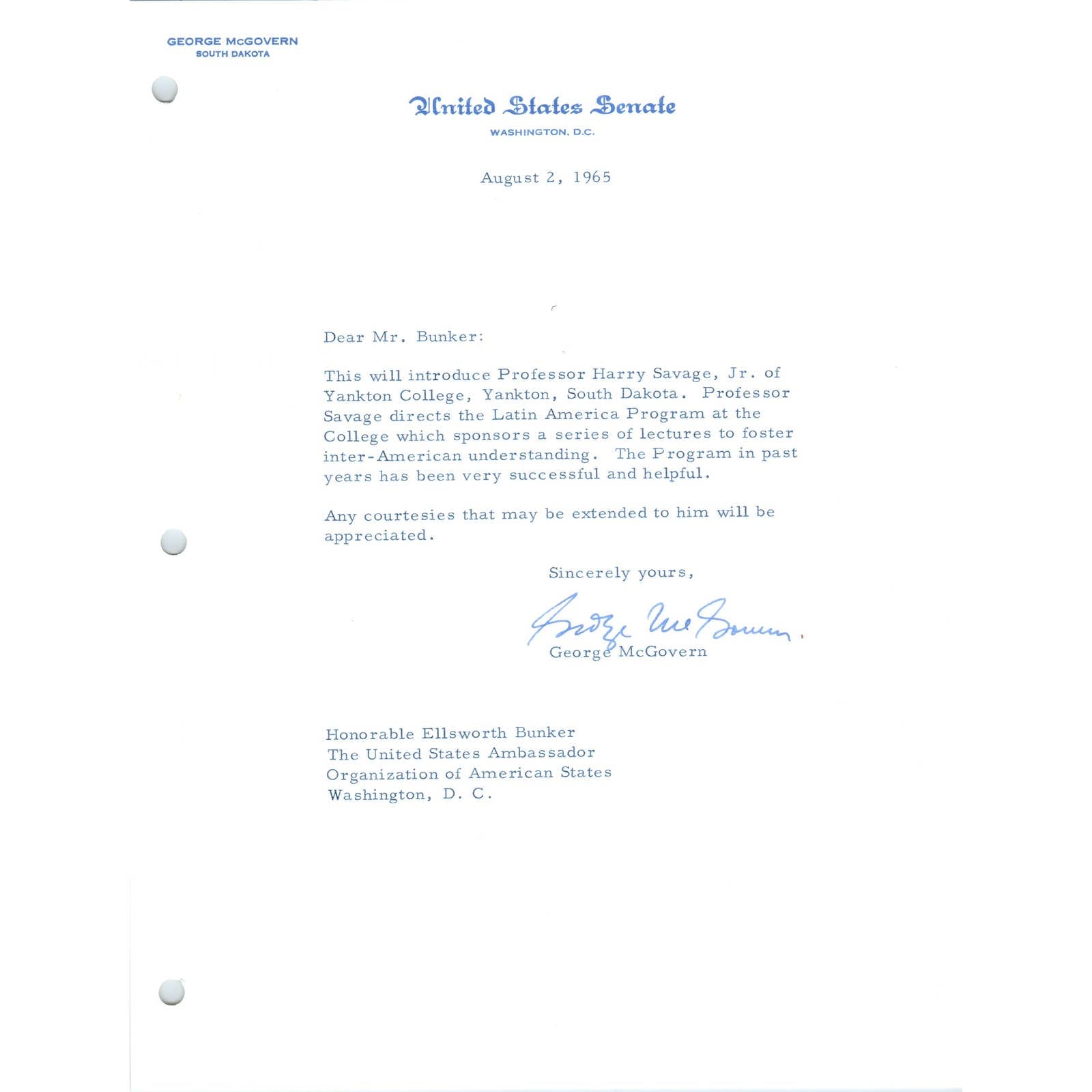South Dakota Senator George McGovern Official Letterhead Signed Aug 1964 TK1-GM