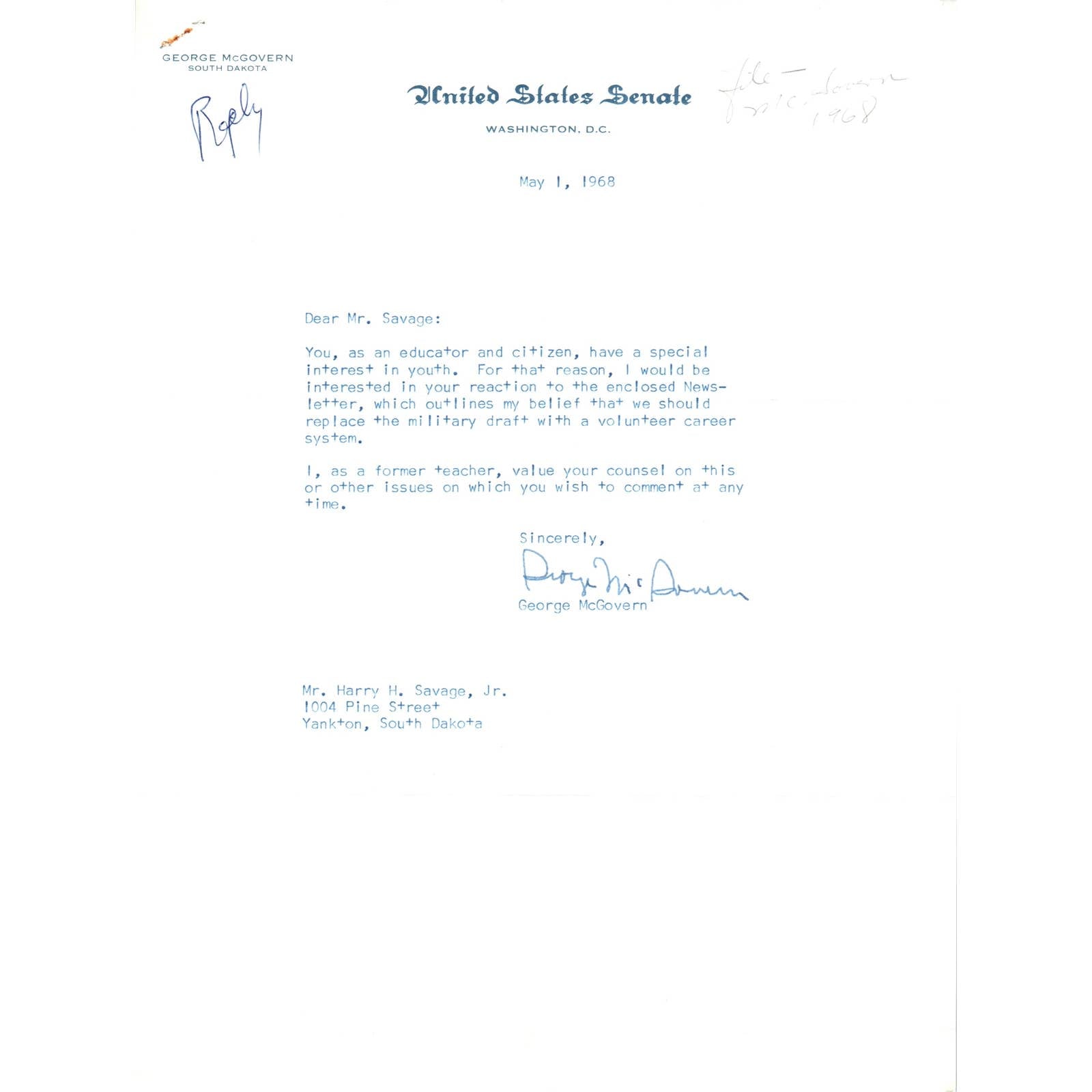 Please note, there are several of these available. They do not all look exactly the same, but are all signed memos from George McGovern in 1968. They may have blemishes, paper clip marks, or small notes handwritten on them. These documents came from a large grouping that belonged to the staff of Yankton College in South Dakota from the 1960s. See pics for condition.