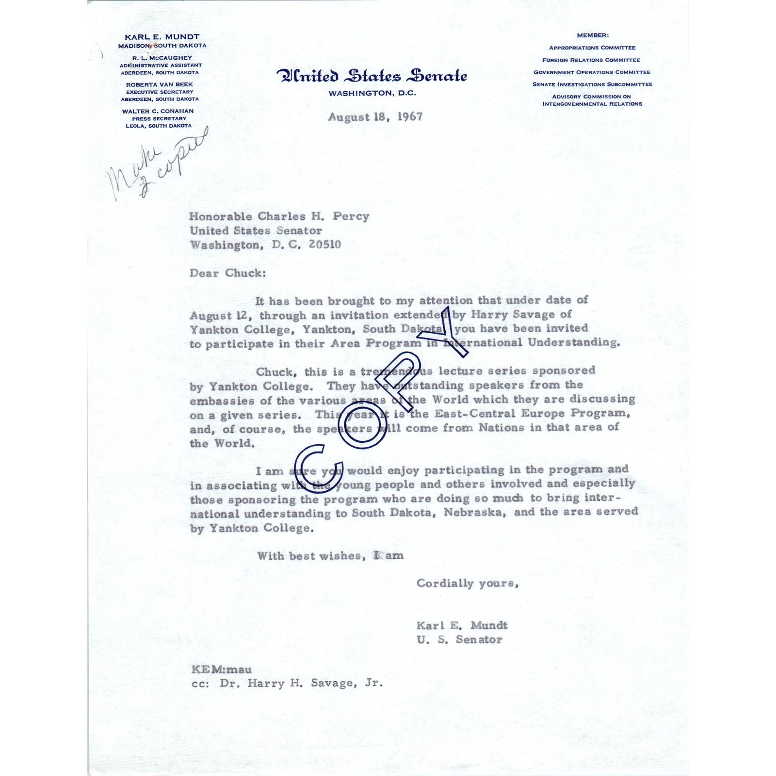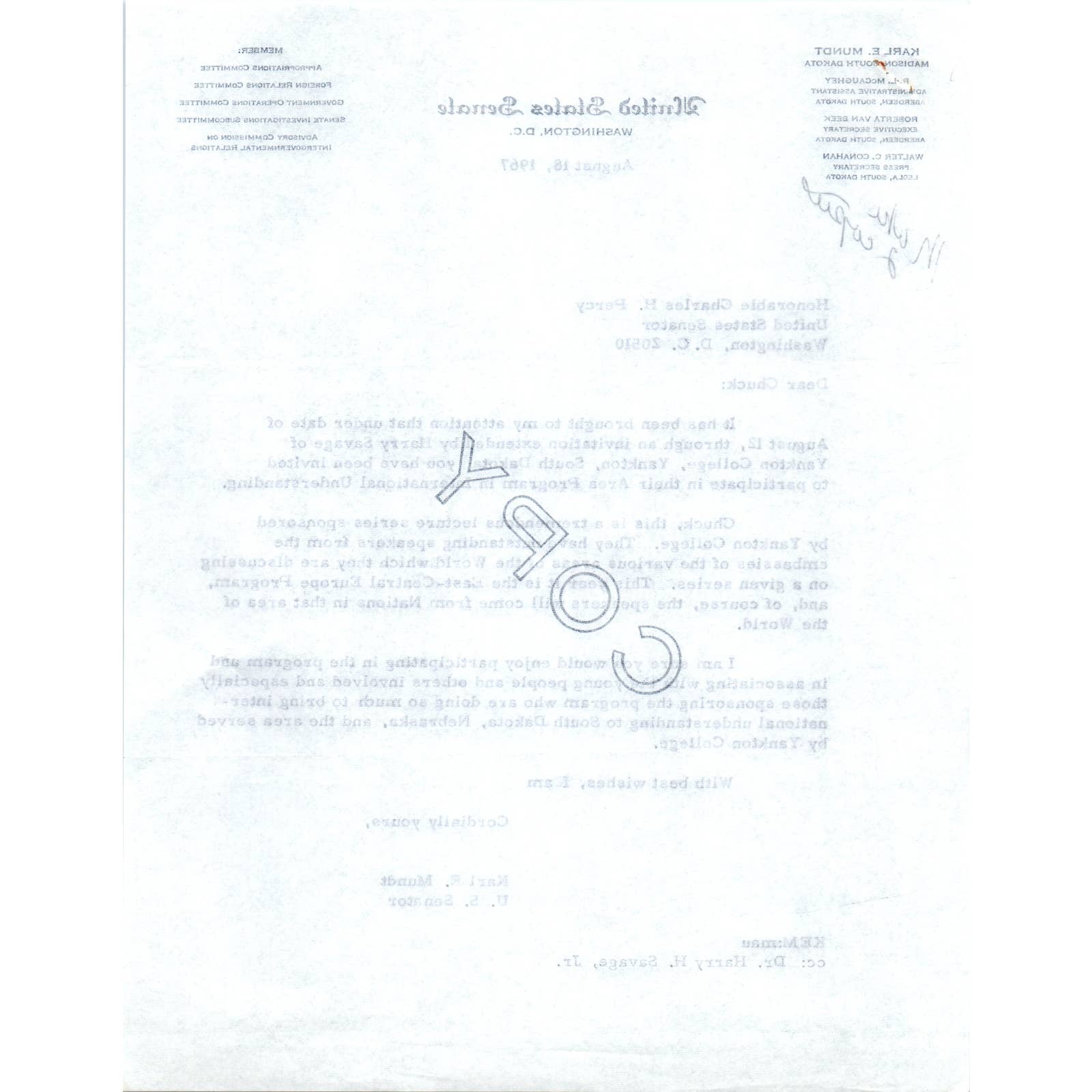 South Dakota Senator Karl Mundt Official Letterhead Memo Copy 1967 TK1-P6