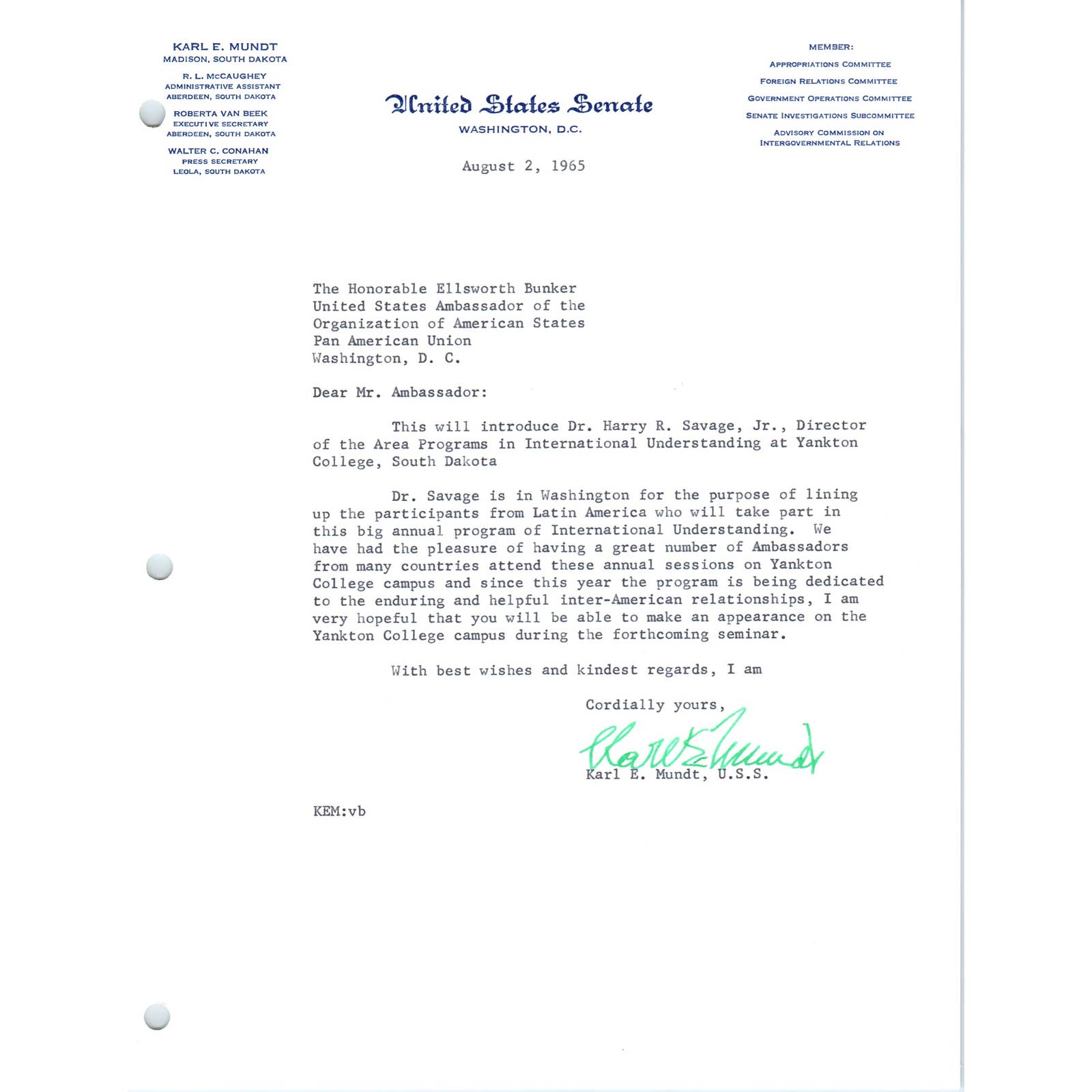 South Dakota Senator Karl Mundt Official Letterhead Signed Memo 1965 TK1-P6