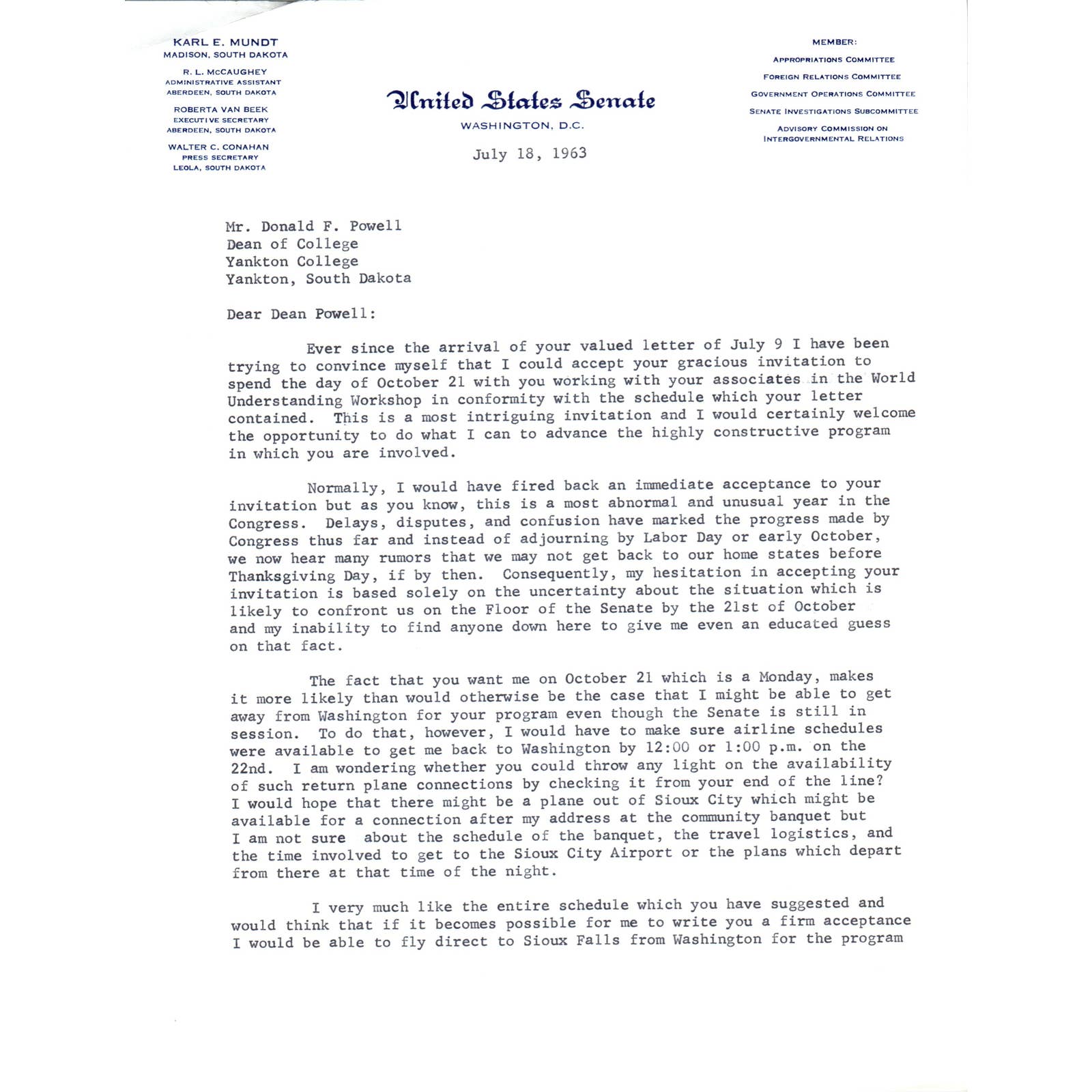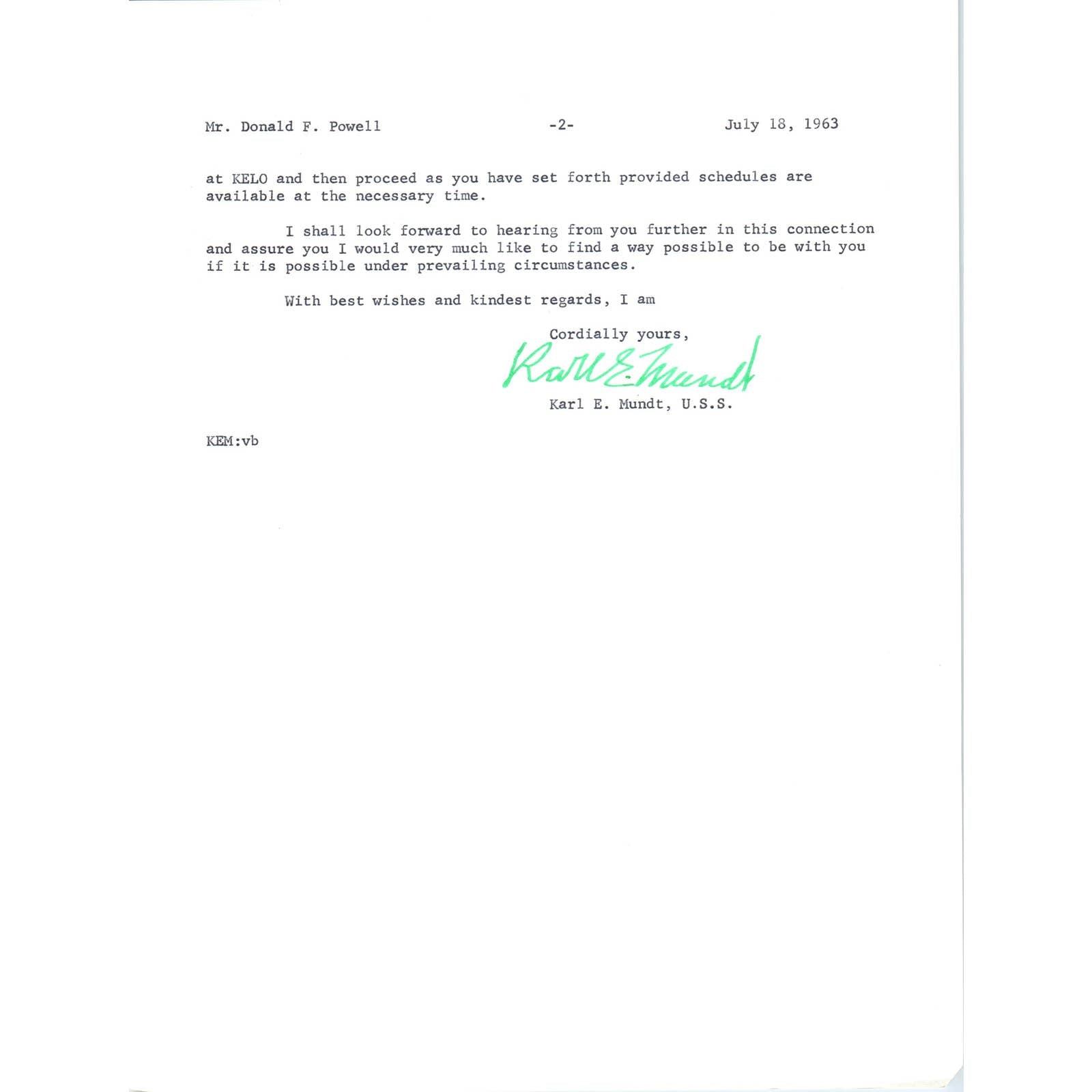 South Dakota Senator Karl Mundt Official Letterhead Signed Memo Jul 1963 TK1-P6