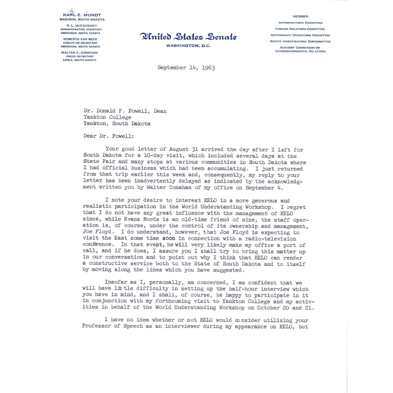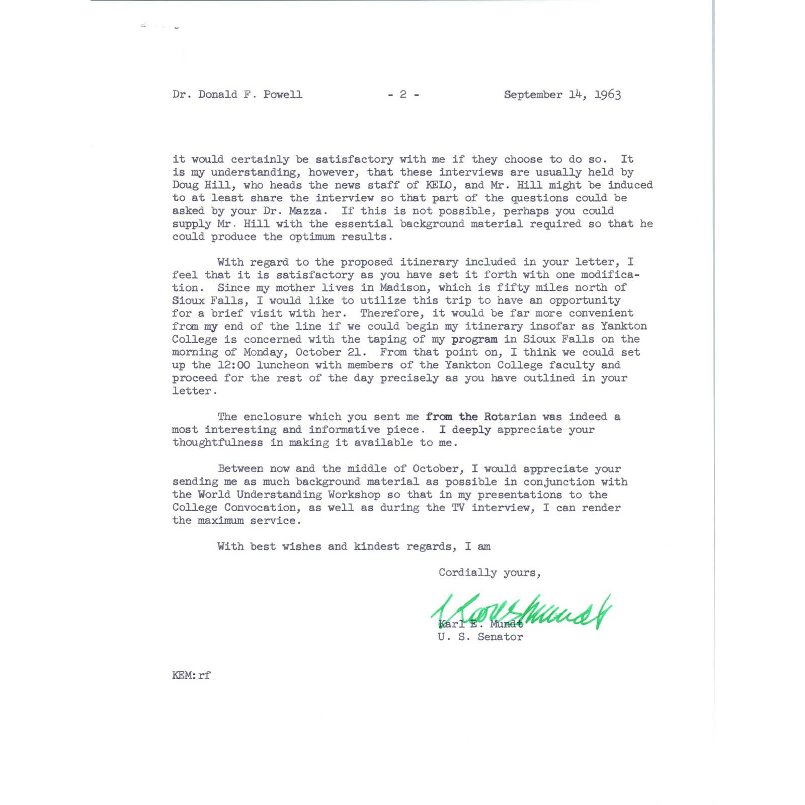 South Dakota Senator Karl Mundt Official Letterhead Signed Memo Sep 1963 TK1-P6