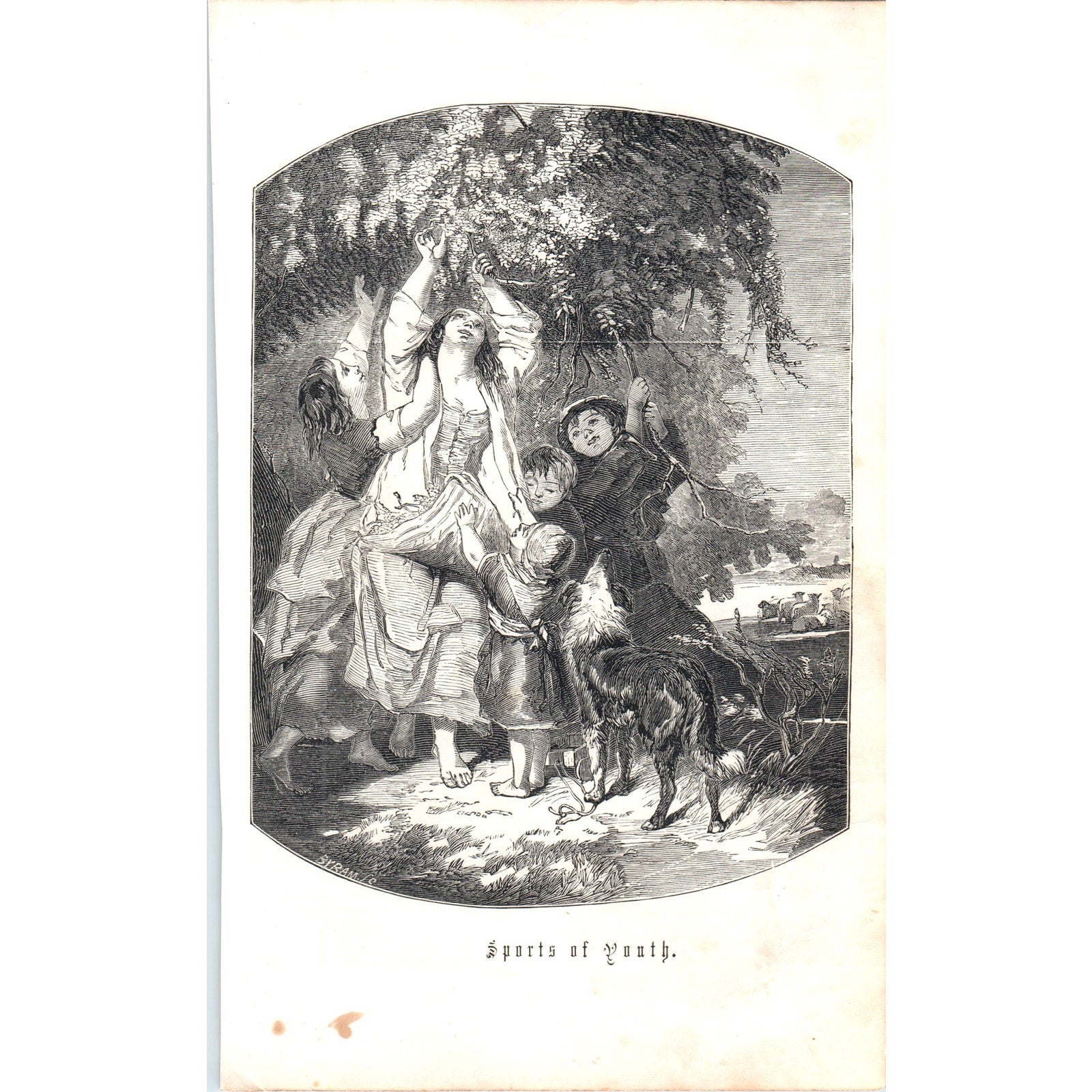 Sports of Youth - Children and Dog Picking Fruit 1857 Original Art Engraving D19-4