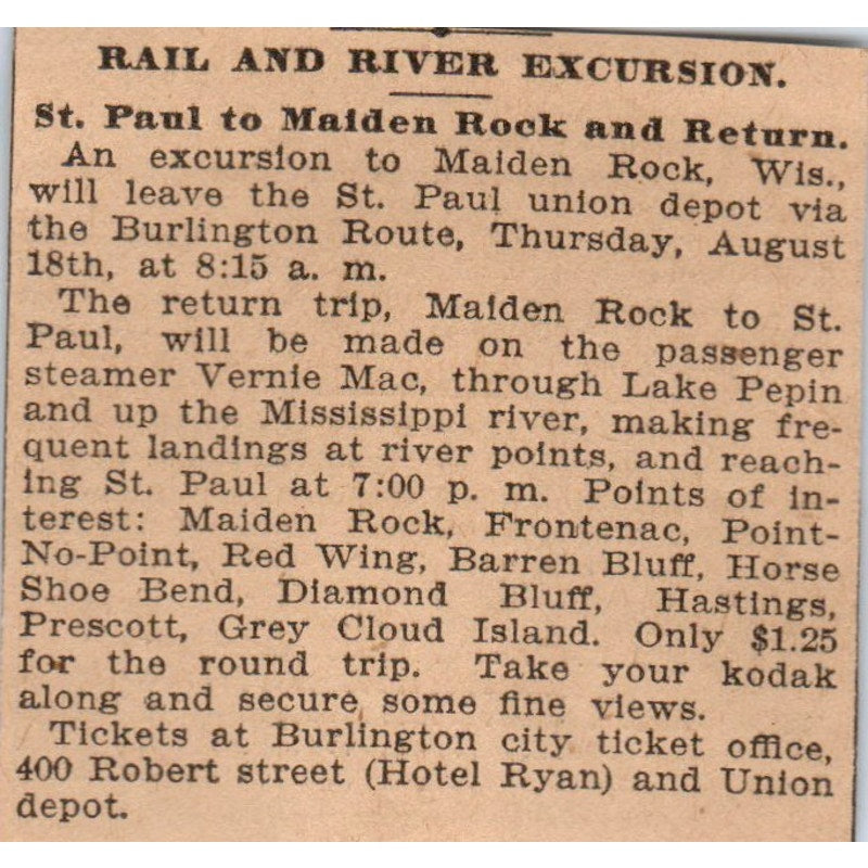 St. Paul to Maiden Rock WI Rail and River Excursion St. Paul 1898 Newspaper Ad AF2-Q2