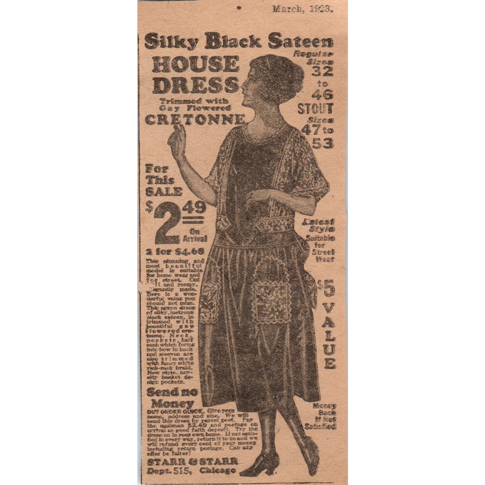 Starr & Starr Chicago Sateen House Dress Mail Order 1923 Magazine Ad Clip AE1-4