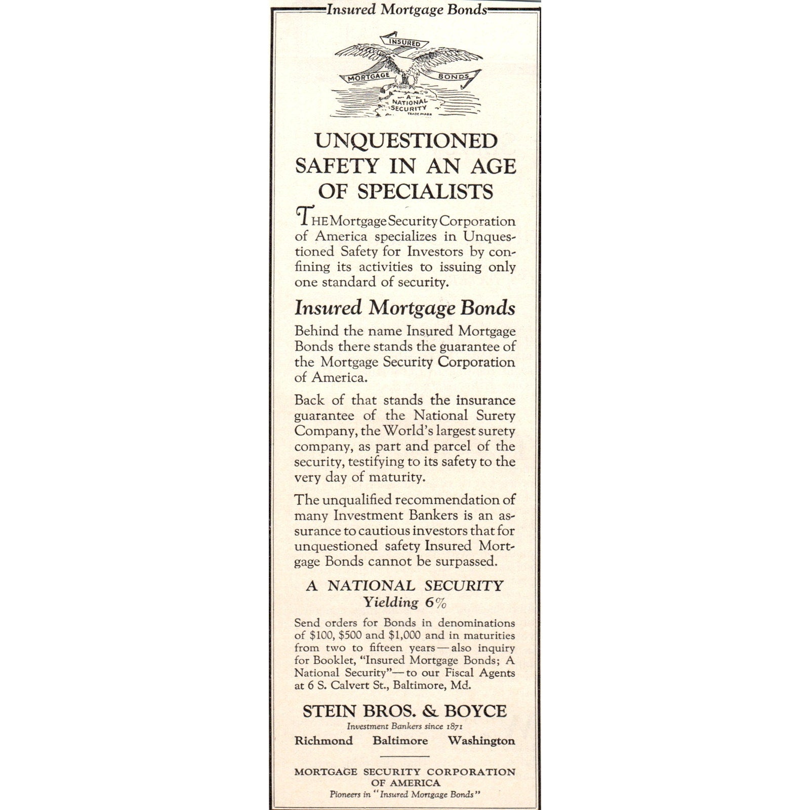 Stein Bros. & Boyce Mortgage Security 1924 Magazine Ad AF2-A1