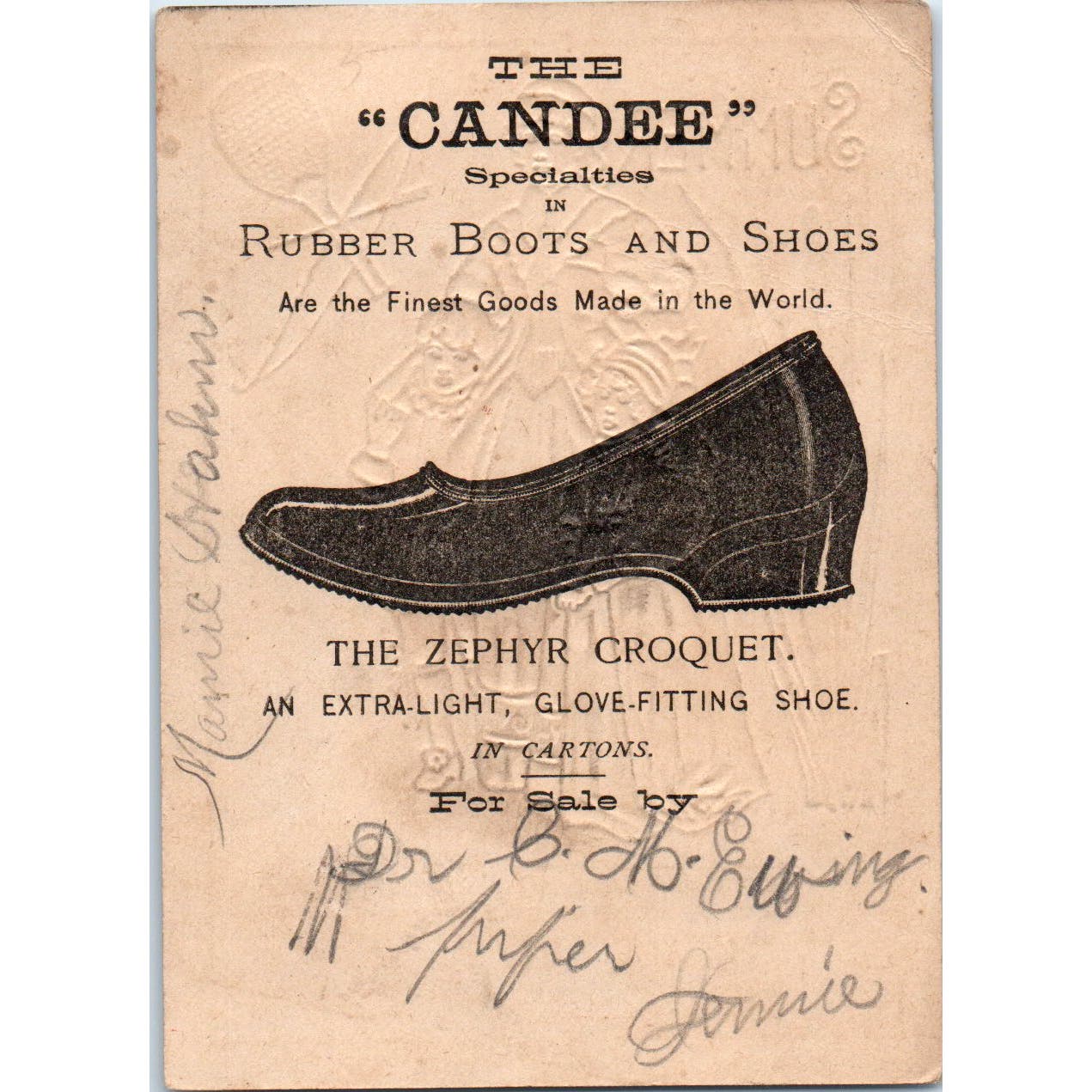Summer - Candee Rubber Boots & Shoes Zephyr Croquet c1880 Victorian Trade Card AE5