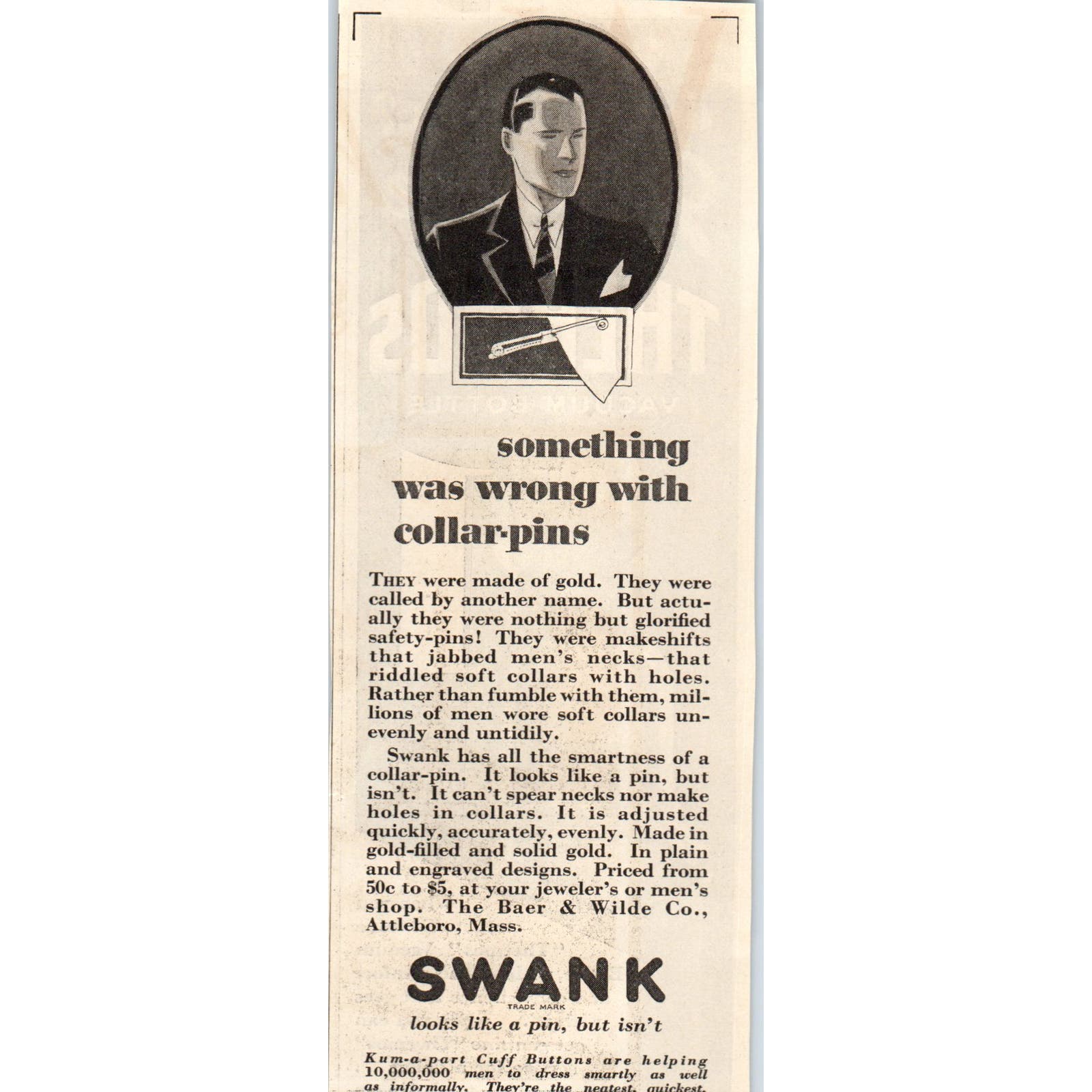Swank Collar Pins Kum-a-Part Cuff Buttons 1928 Original Advertisement AE5-SSE