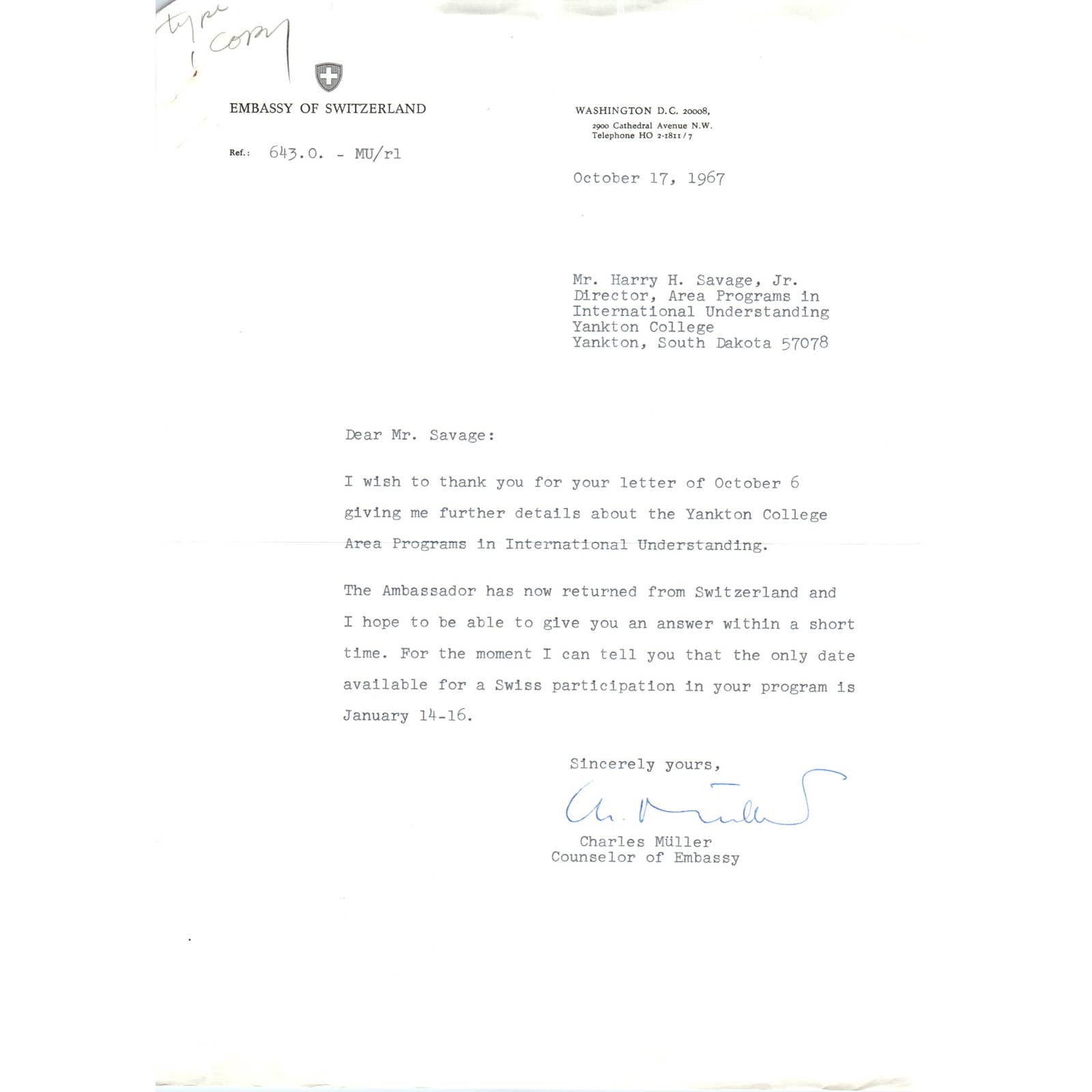 Switzerland Embassy Official Letterhead Memo Charles Muller 1967 TK1-P11