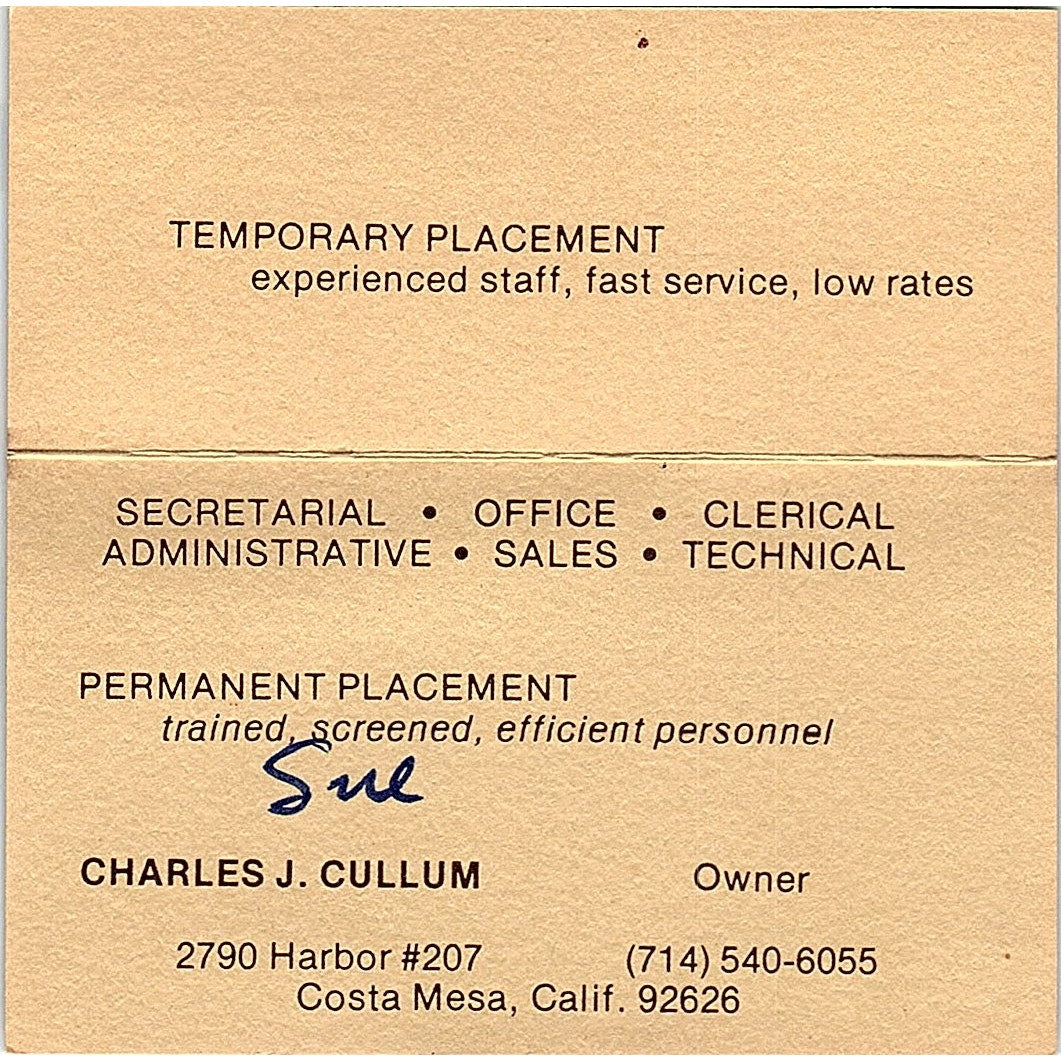 Temporary Placement Charles J. Cullum Costa Mesa CA Vintage Business Card SB4-B2