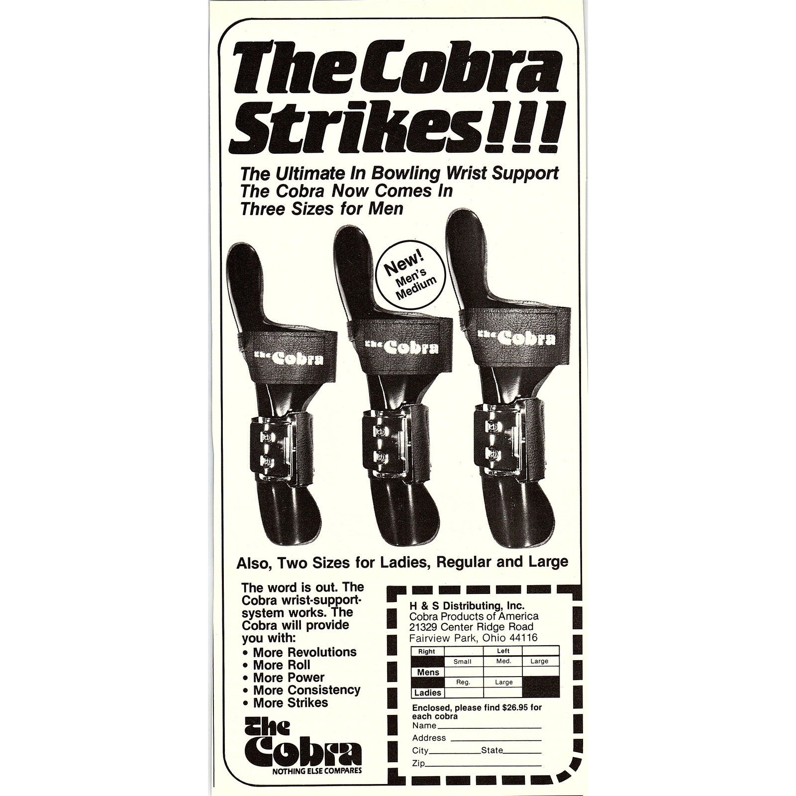 The Cobra - Bowling Wrist Support H&S Distributing Fairview Park OH 5x10" 1983 Ad AF6-17