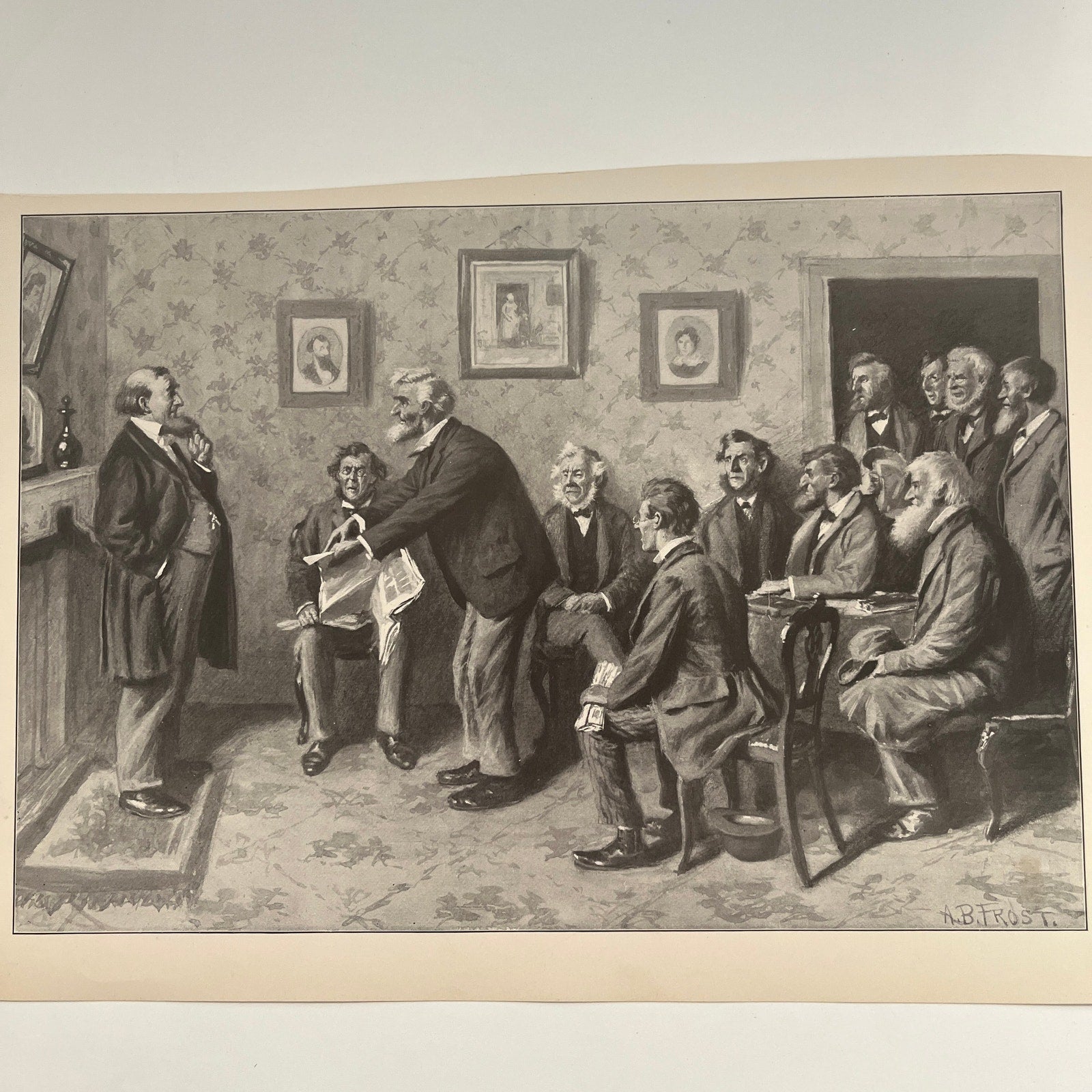 WILL NEED TO BE RETRIMMED CLOSE TO IMAGE BORDER. Has been cut unevenly, would benefit from being trimmed better. Reflected in the price. Measures Approximately 10x15". Original piece taken from 1904 A Book of Drawing - A.B. Frost. Back side has a description of a different piece, due to the way book was constructed. Has regular wear and tear you would expect from a piece this age. See pics for condition.