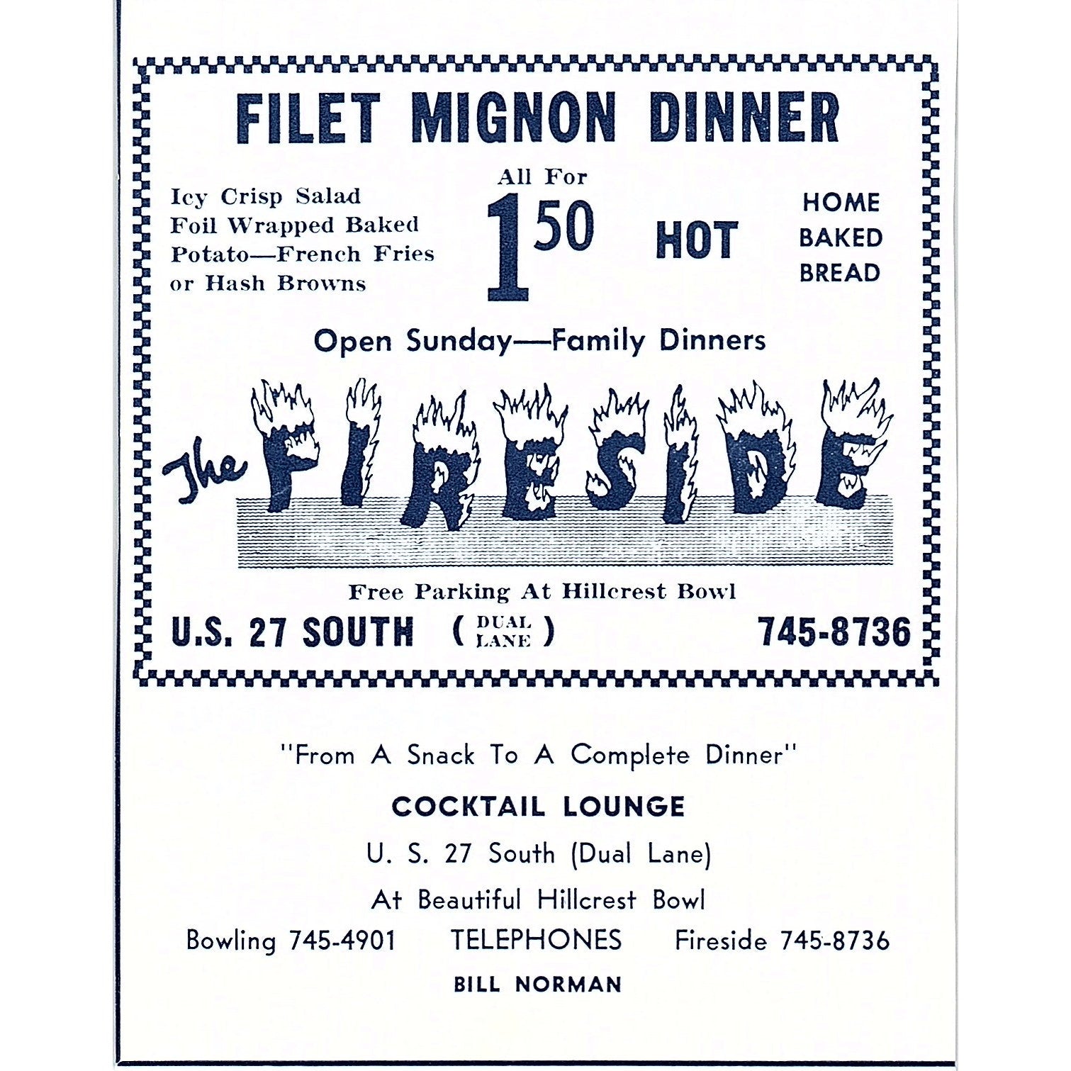 The Fireside Restaurant Bill Norman Fillet Mignon Dinner Ft. Wayne 1964 Ad AG1-9