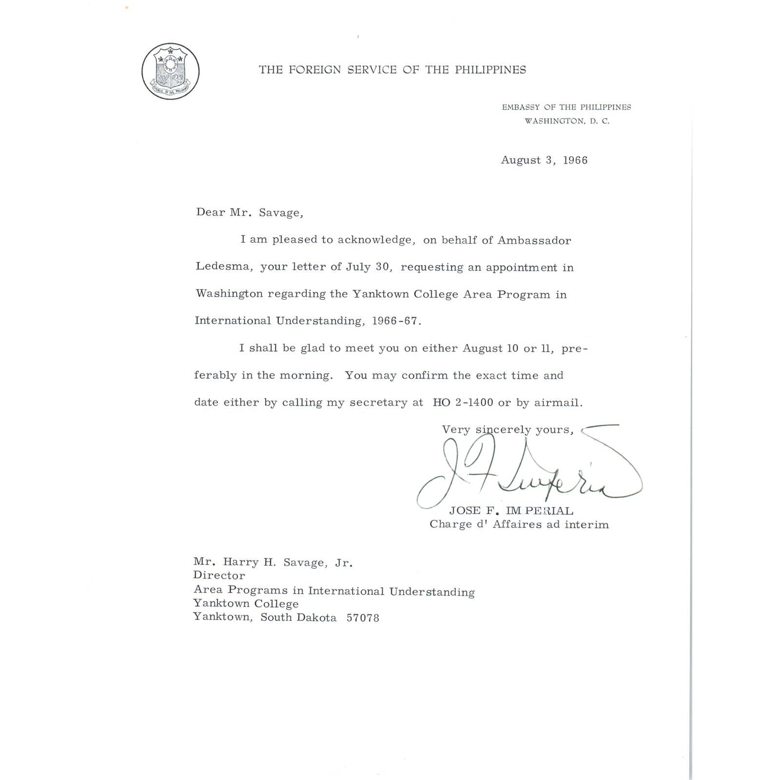 The Foreign Service of the Philippines Letterhead Jose F. Imperial 1966 TK1-P10