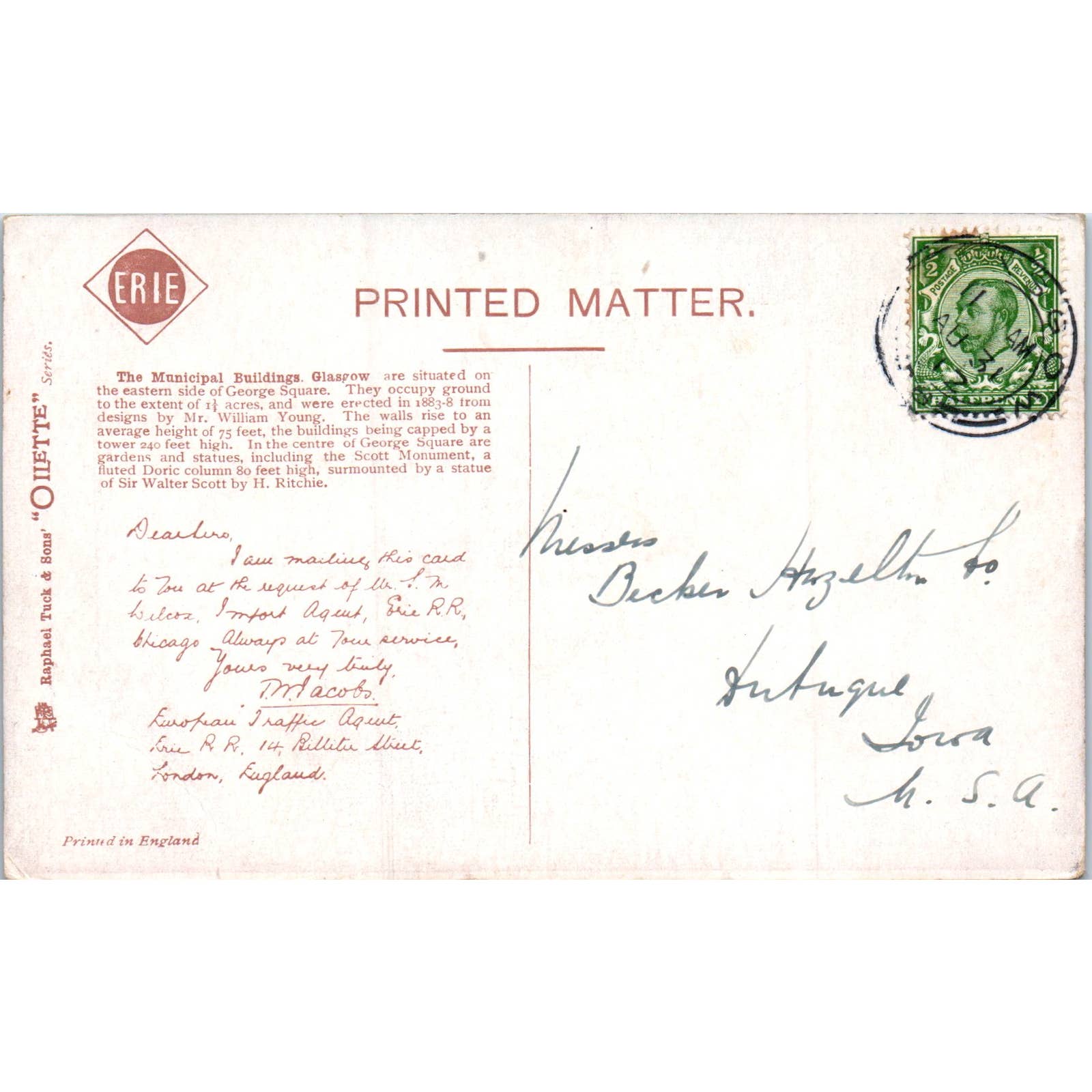 The Municipal Buildings Glasgow Raphael Tuck Oilette Original Postcard TK1-P14