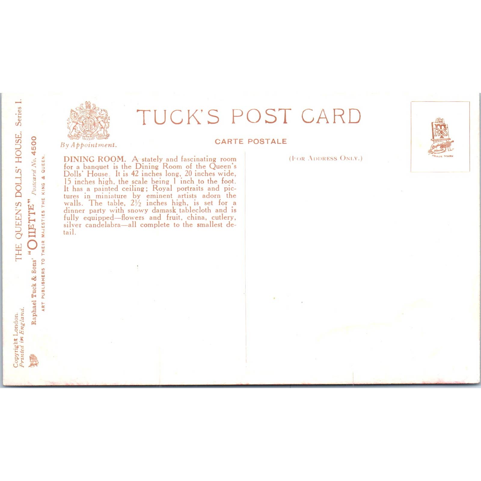 The Queen's Dollhouse Dining Room Raphael Tuck Oilette Original Postcard TK1-P17