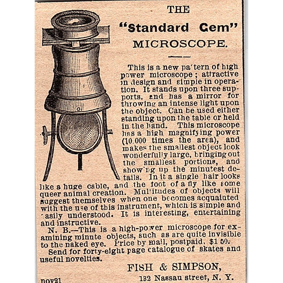 The Standard Gem Microscope Fish & Simpson 132 Nassau St NY 1878 Ad AG2-M13