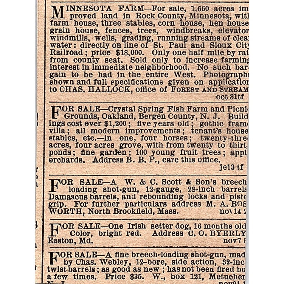 THIS IS A SMALL AD Approx 2.5x3". Original piece taken from 1878 Forest & Stream Rod & Gun Magazine. Paper is fragile and can flake off easily. May have small tears, chunks missing, or other blemishes you would expect from something this age. See pics for condition.