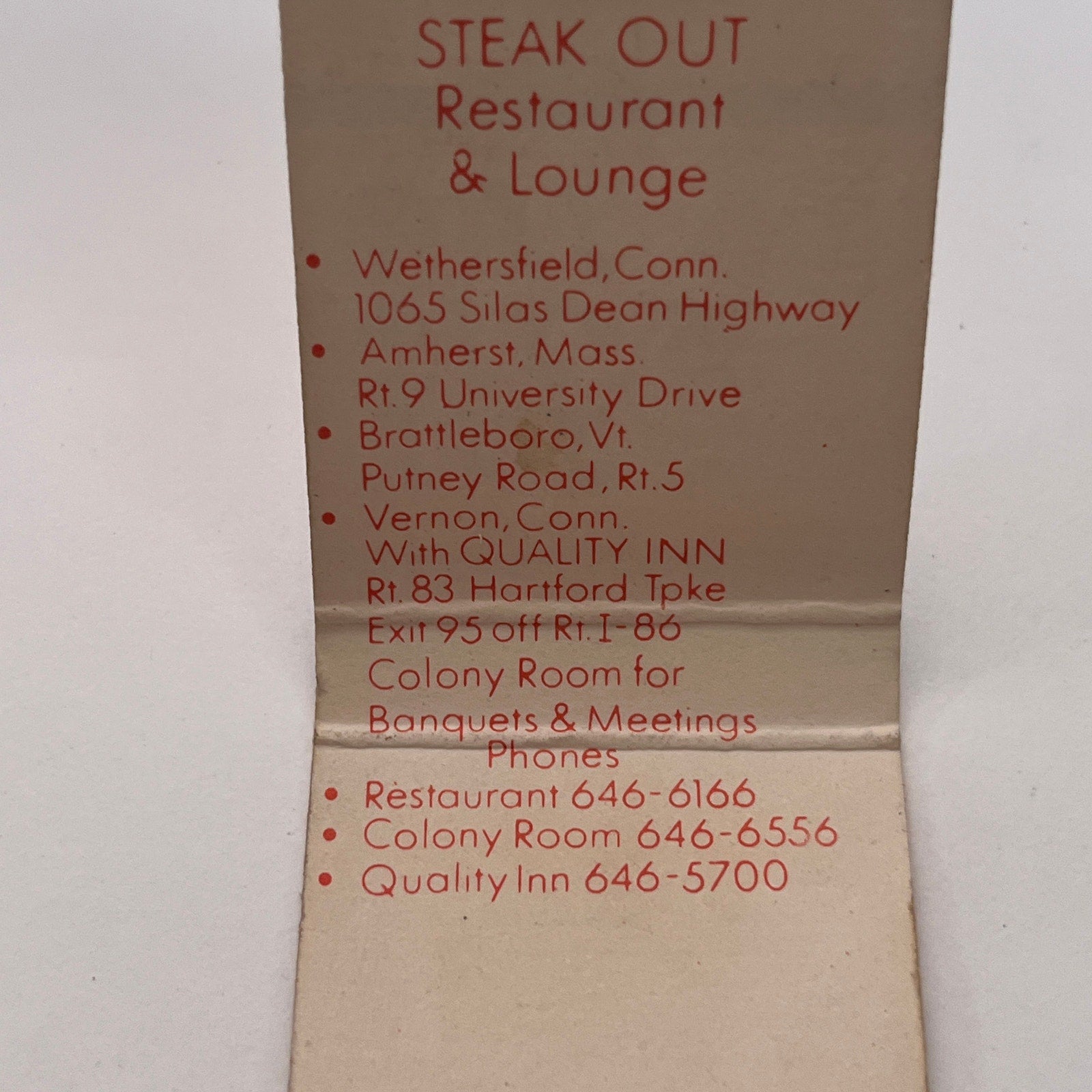 The Steak Out Restaurant Wethersfield CT Vintage Matchbook Cover TB8-MB-13