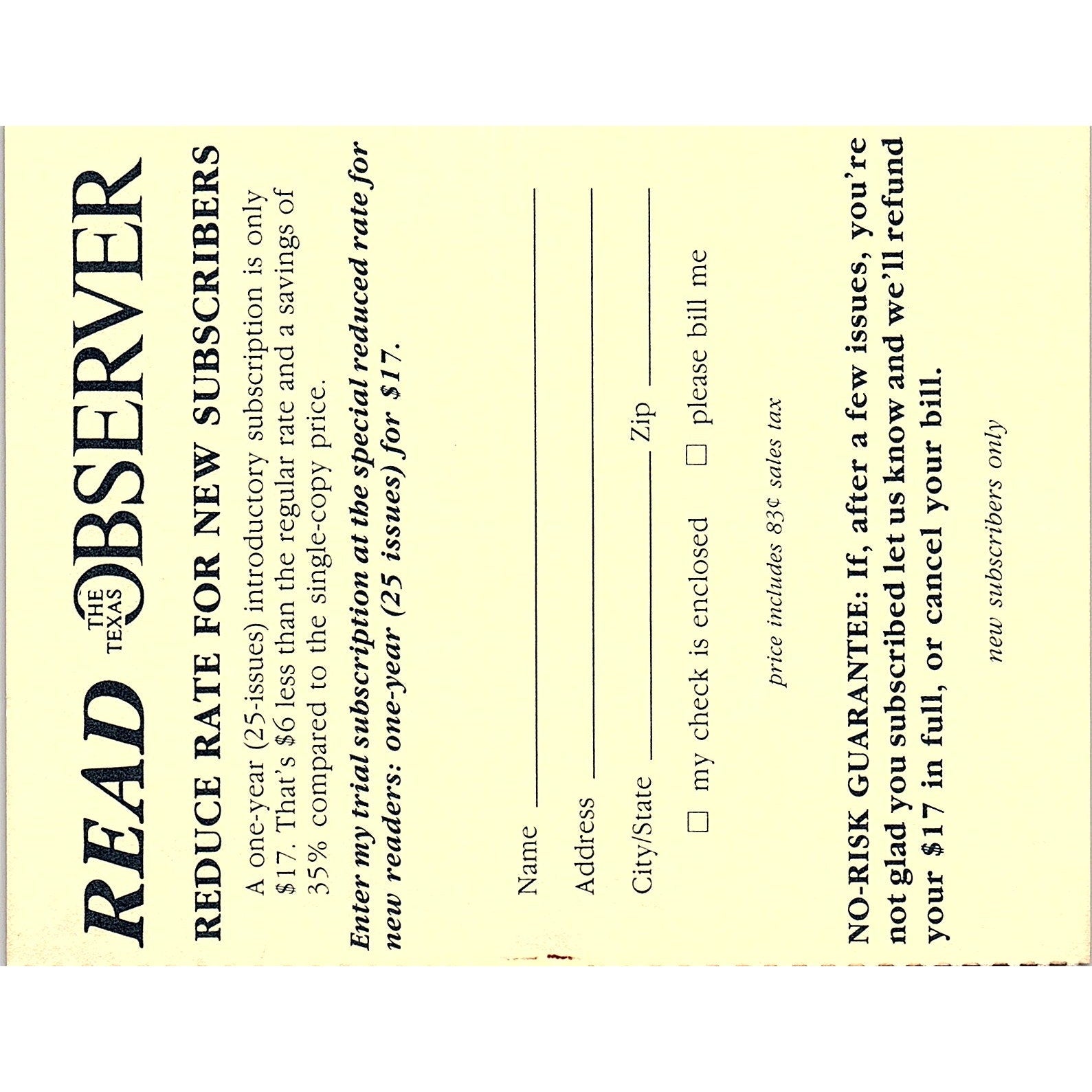 The Texas Observer Blank Postal Mailing Card Austin TX 1984 Ad AF6-9