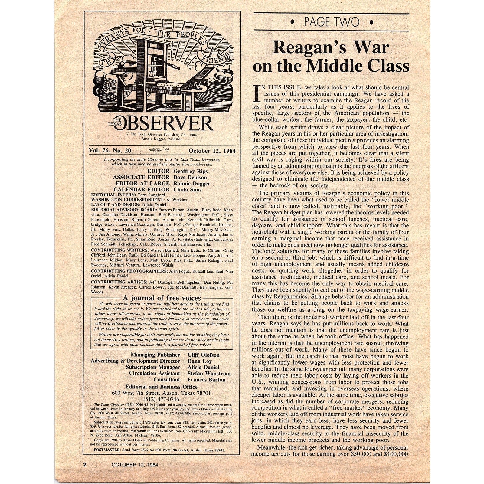 The Texas Observer Oct 1984 Cover Only - Ronald Reagan Caricature 1984 Ad AF6-9