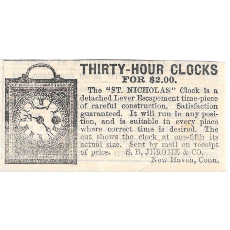 Thirty Hour Clocks S.B. Jerome & Co New Haven CT - Ad 1878 Original TJ7-L2-4