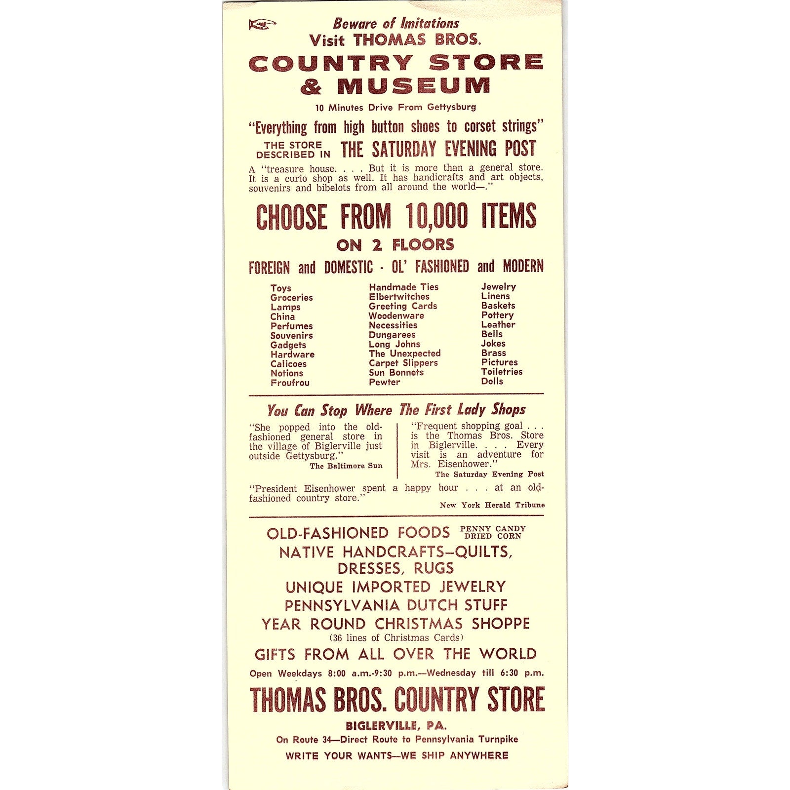 Thomas Bros. Country Store Biglerville PA Vintage Travel Leaflet TH2-TB5
