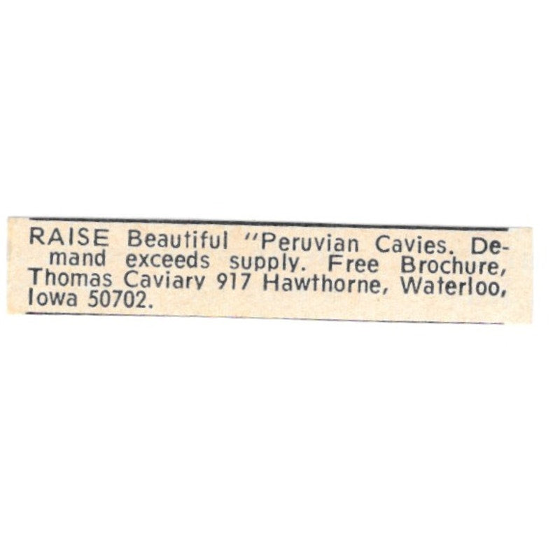 Thomas Caviary Peruvian Cavies Waterloo Iowa 1977 Ad AF6-S5