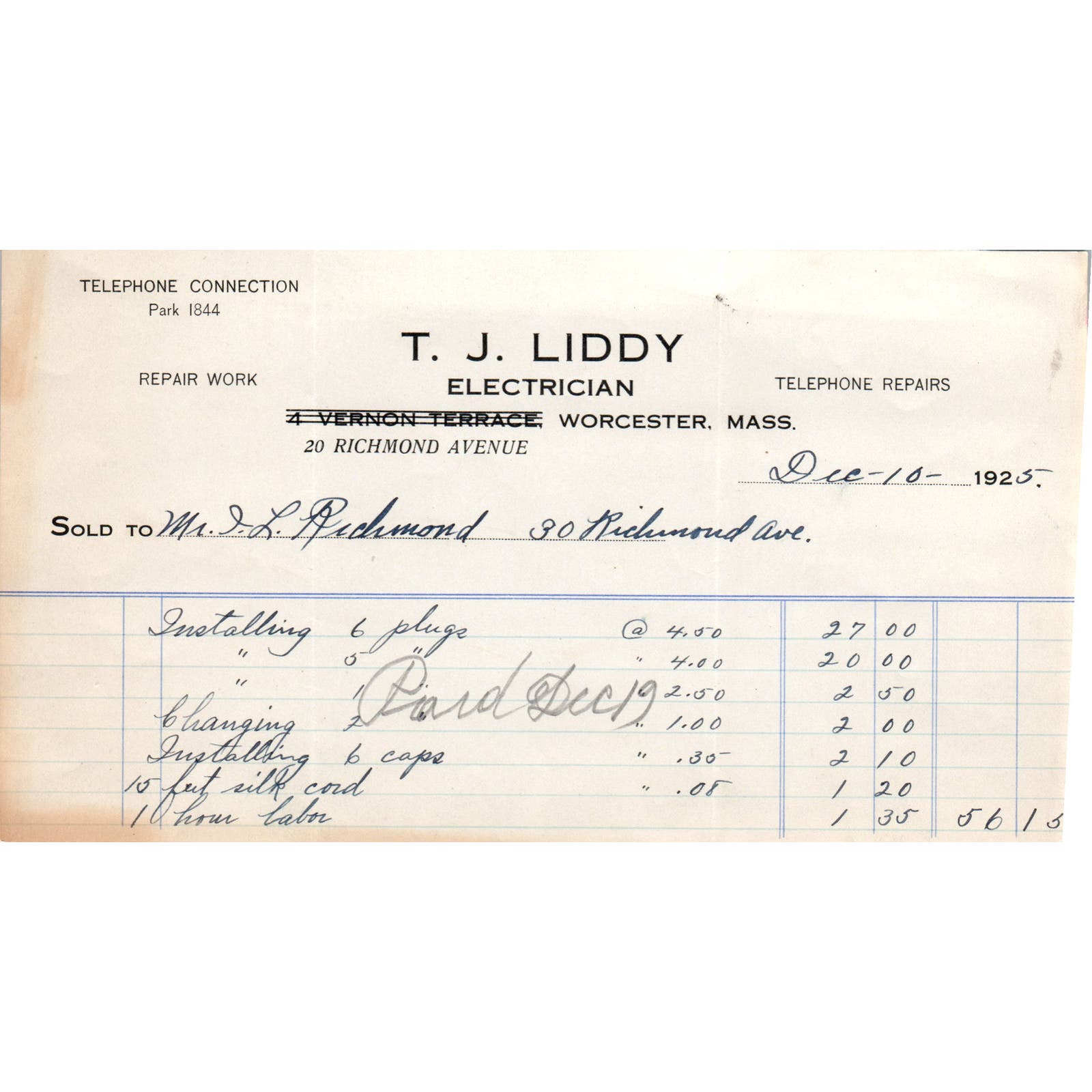 TJ Liddy Electrician Worcester MA 1925 Original Billhead Letterhead Receipt D8-LL
