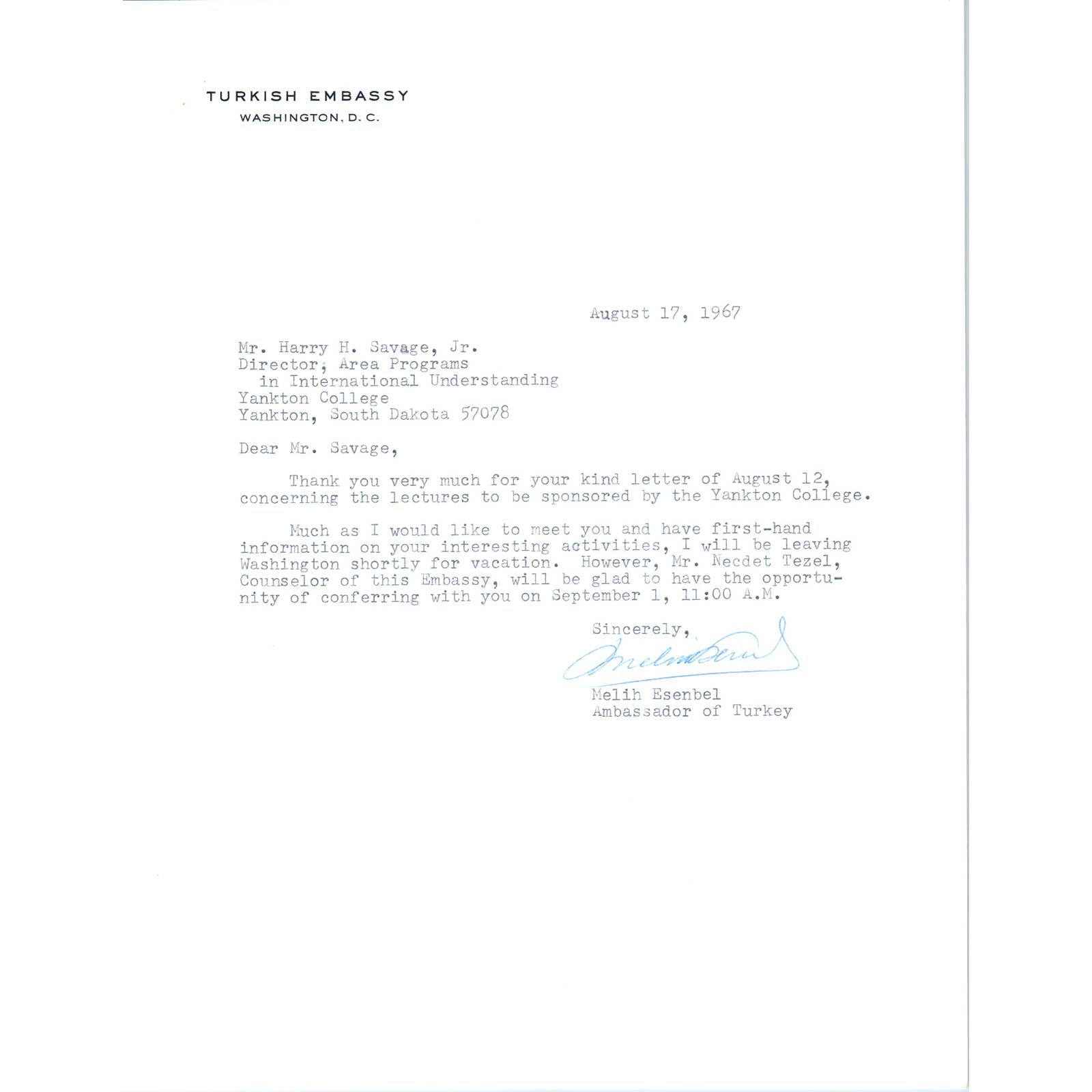 Turkish Embassy Letterhead Memo Melih Esenbel Ambassador Aug 1967 TK1-P11