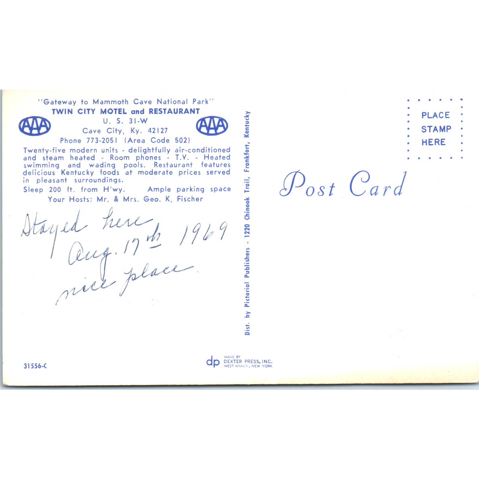 Twin City Motel and Restaurant Cave City KY Geo K. Fischer 1969 - Original Postcard TJ9-P2