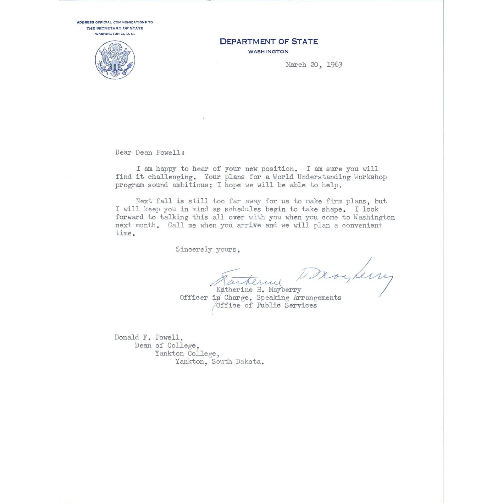 US Department of State Official Letterhead Memo March 20 1963 TK1-P11