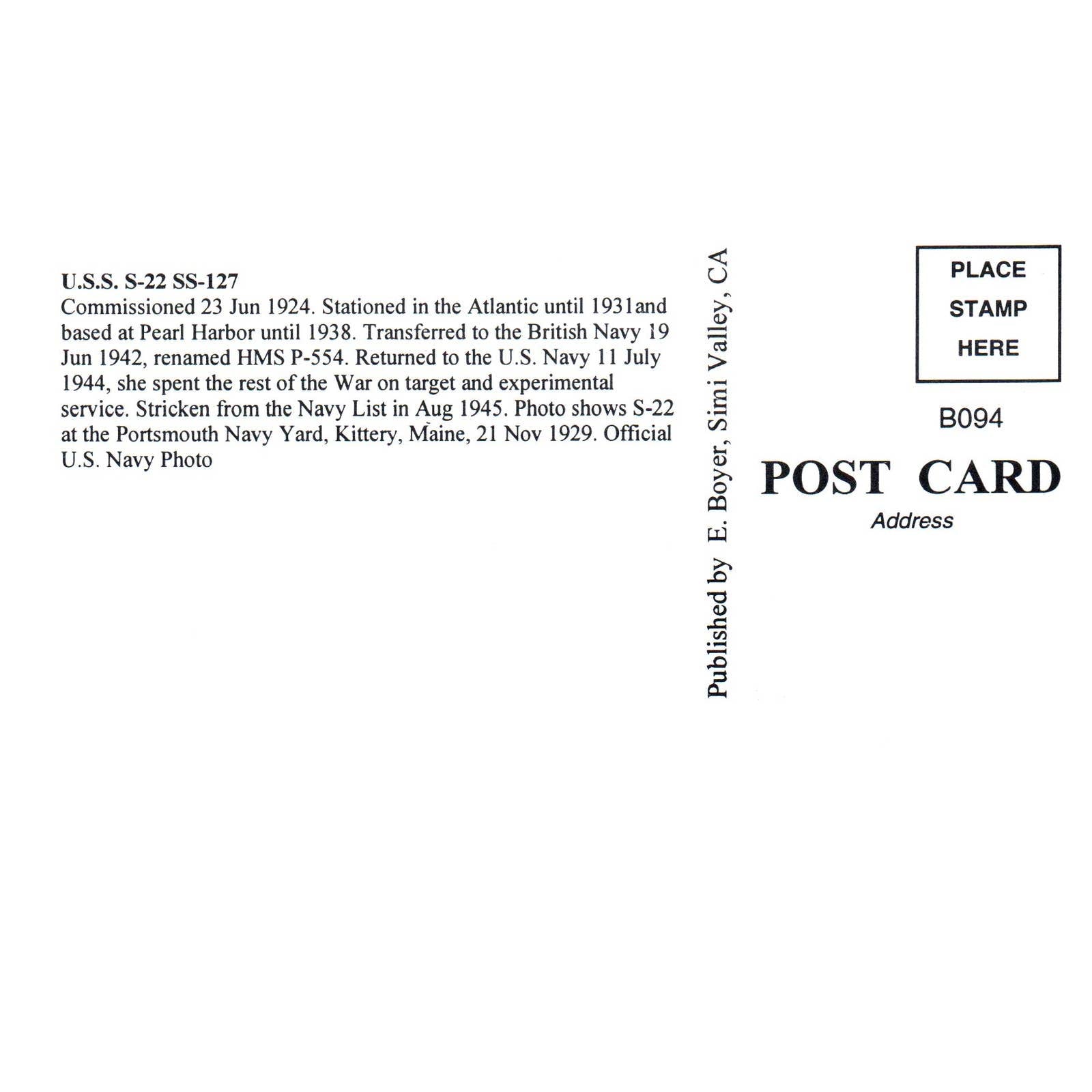 USS S-22, SS-127 - Original Postcard TJ8-5
