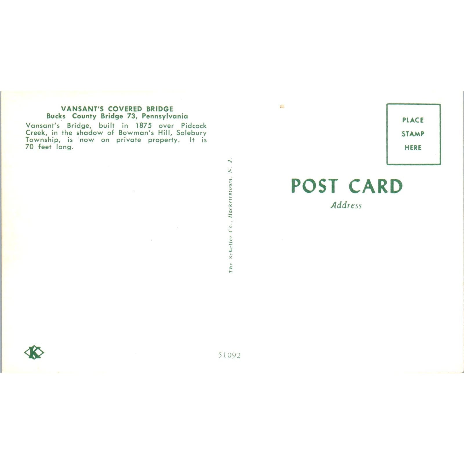 Vasant's Covered Bridge Bucks County 73 PA Vintage Covered Bridge Postcard PD3