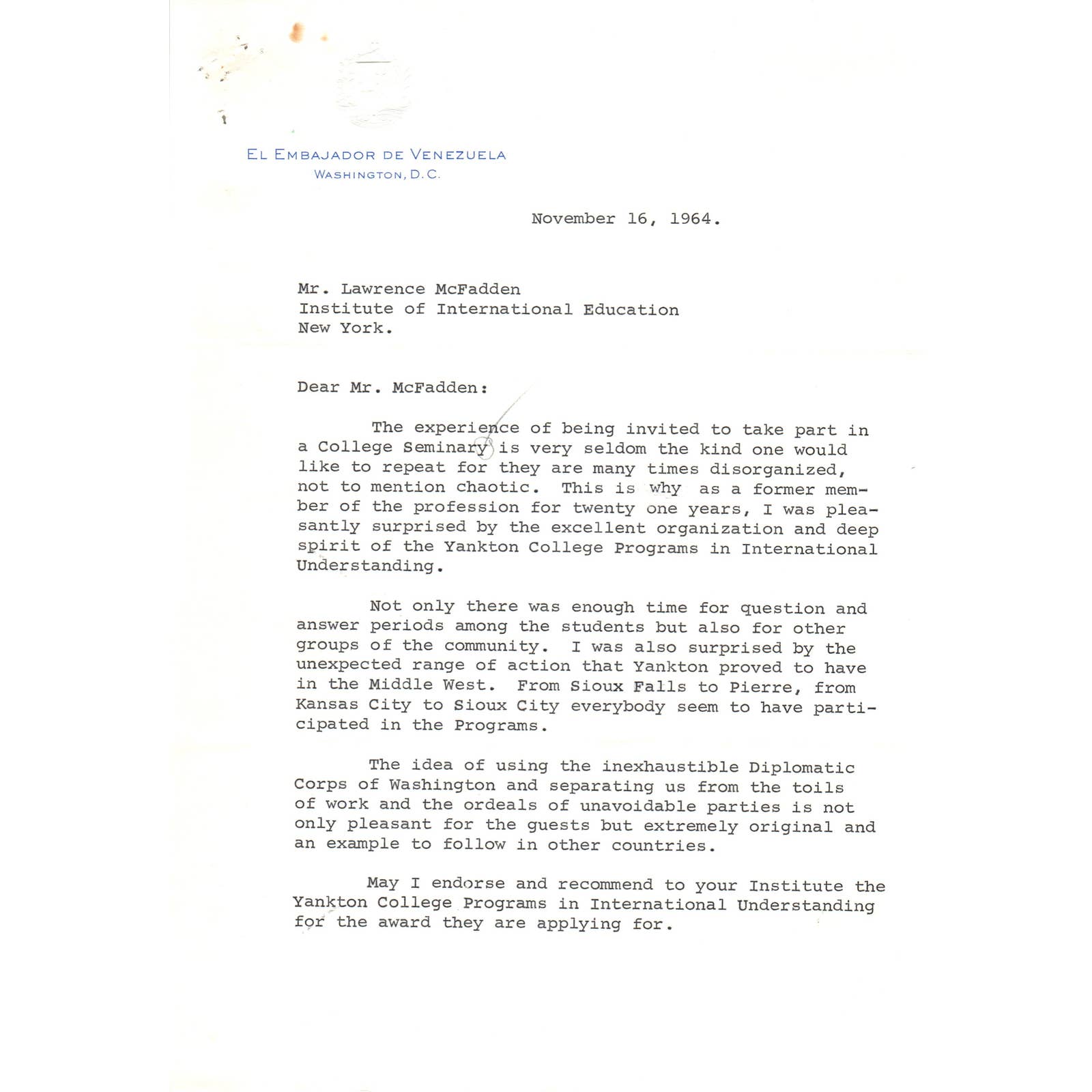 Venezuelan Ambassador Enrique Tejera-Paris Letterhead Memo 1964 TK1-P4