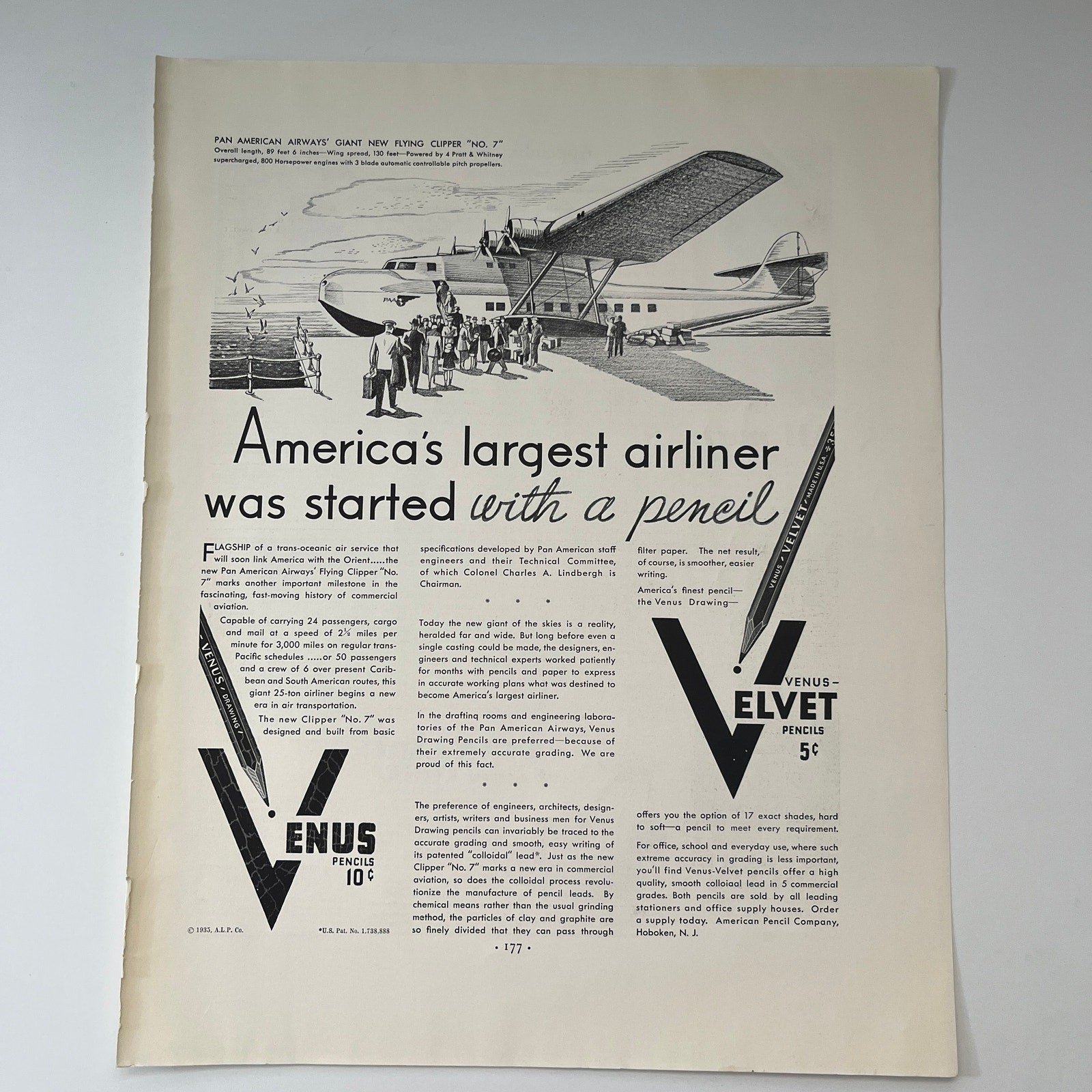 Venus Velvet Pencils Hoboken - Pan American Airways Flying Clipper 1935 Ad V1-4