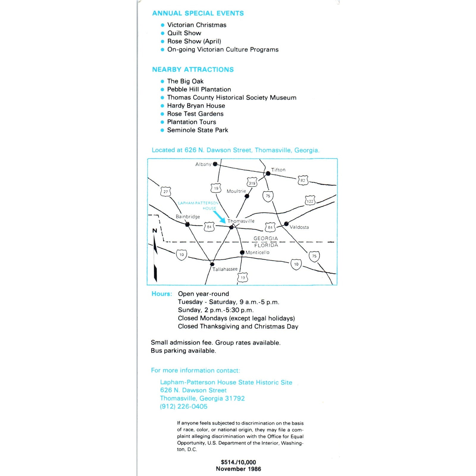 Vintage 1986 Lapham-Patterson House Historic Site Thomasville GA Leaflet TF4-B3