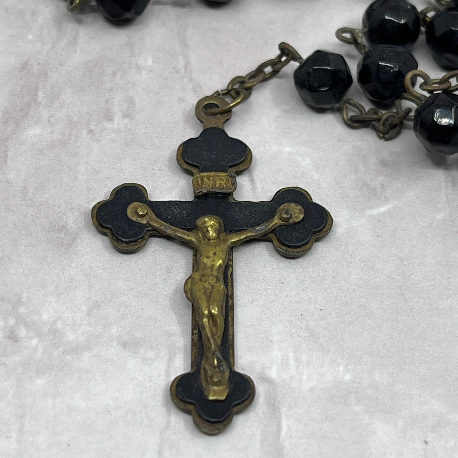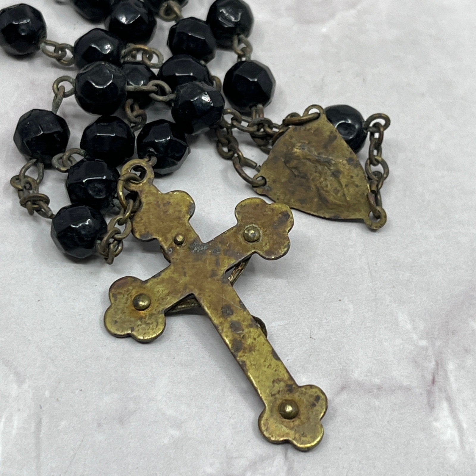 Vintage Black Glass Catholic Rosary Scapular Italy Marian Prayer Beads SE2-1