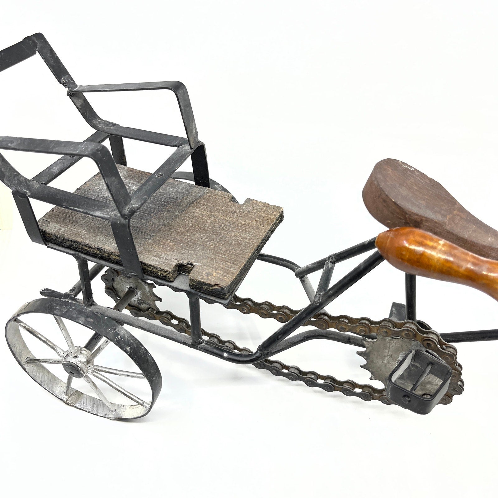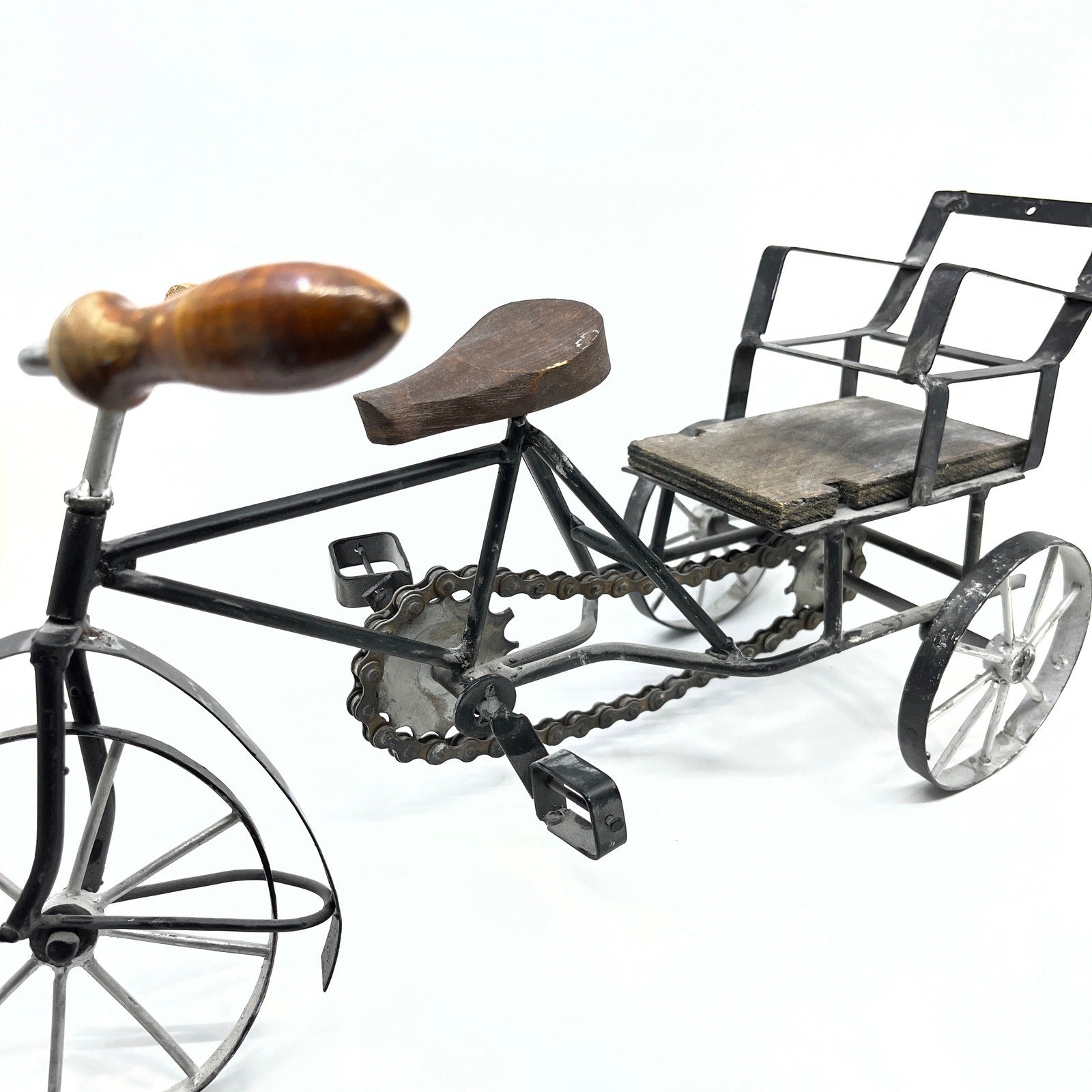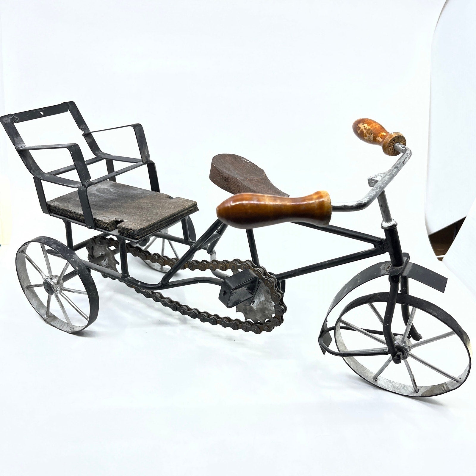 Vintage Hand Crafted Metal Wrought Iron Wood Bicycle Tricycle Sculpture 17x8