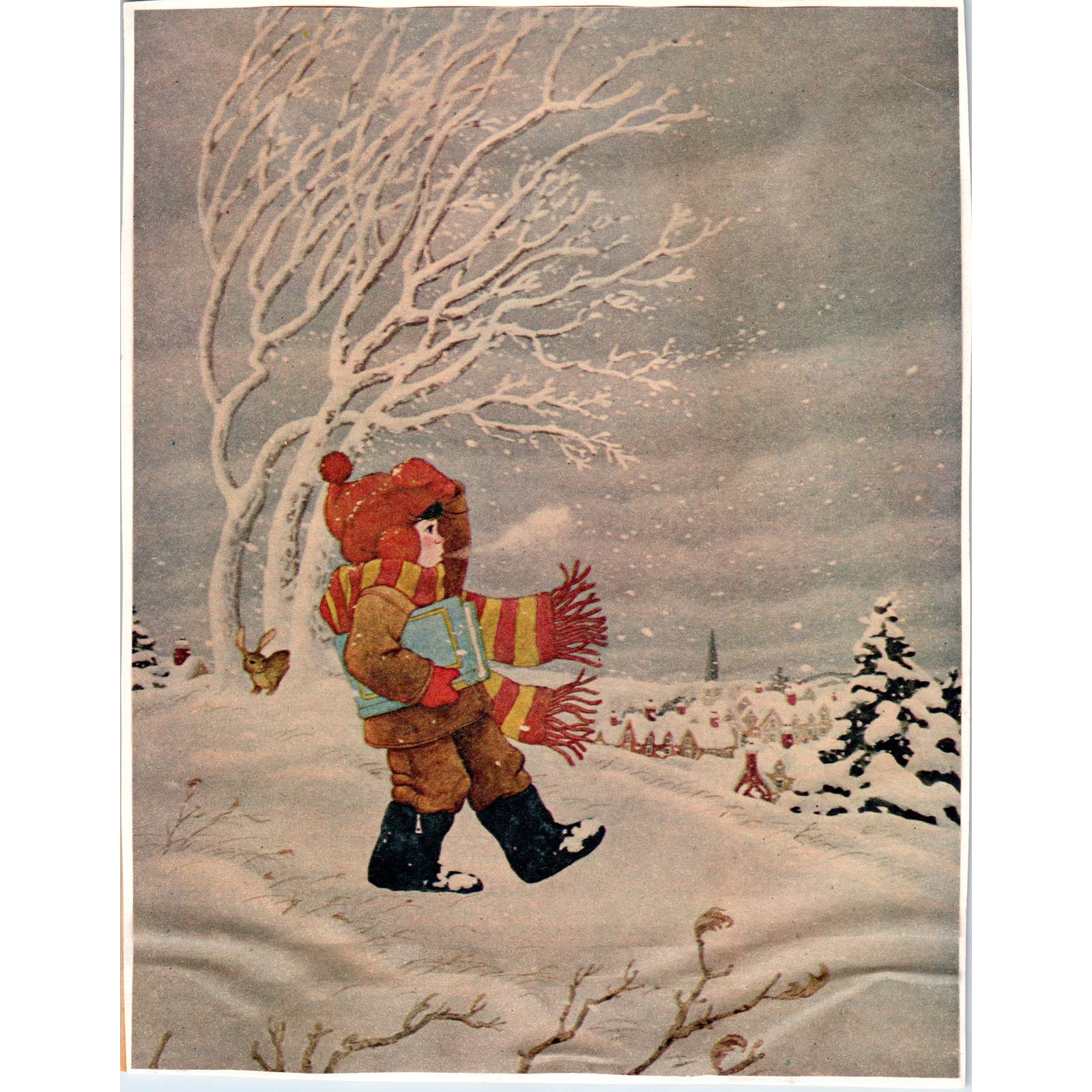 Vintage Kitschy Art Print Little Boy in Snowstorm With Scarf 7x9 TJ1-2