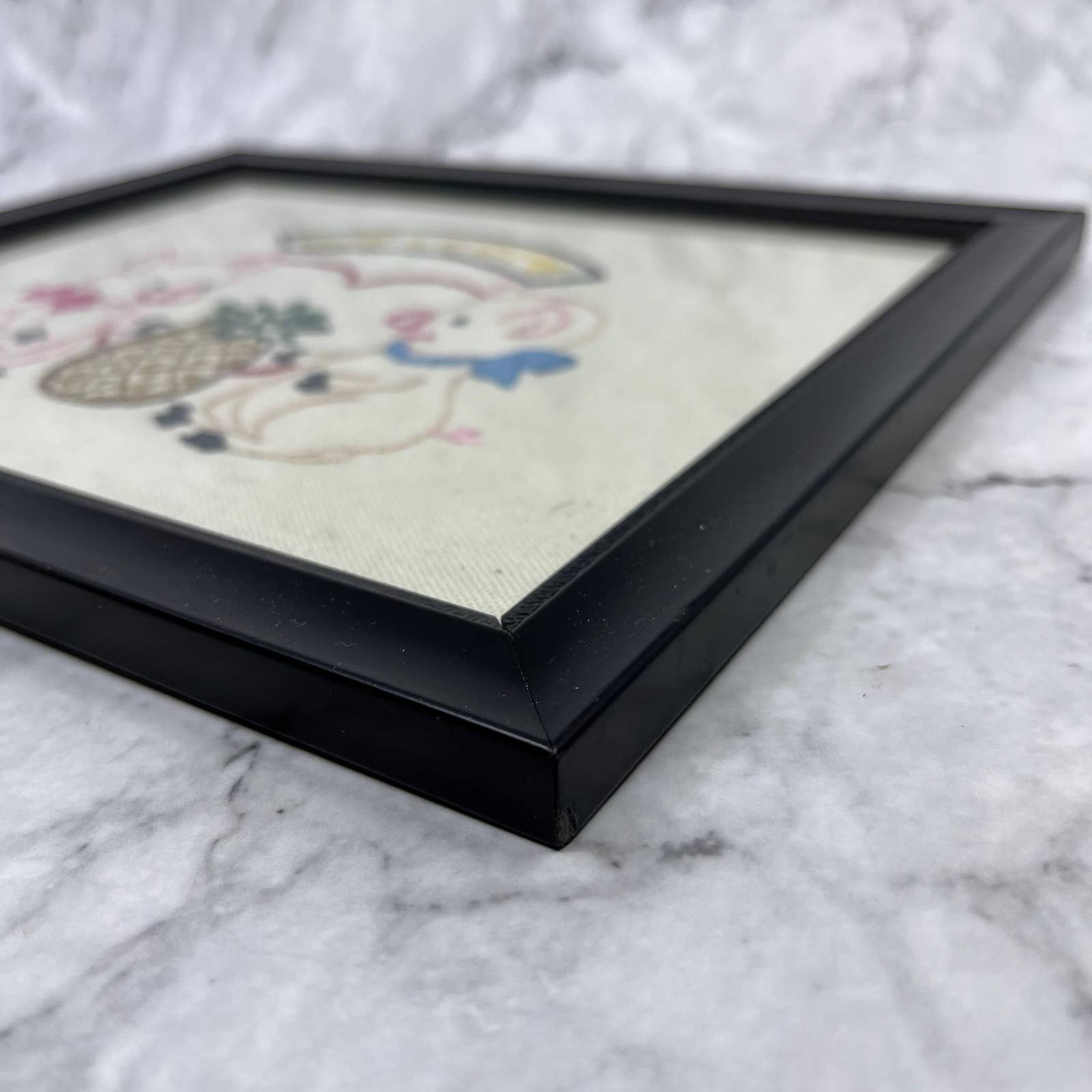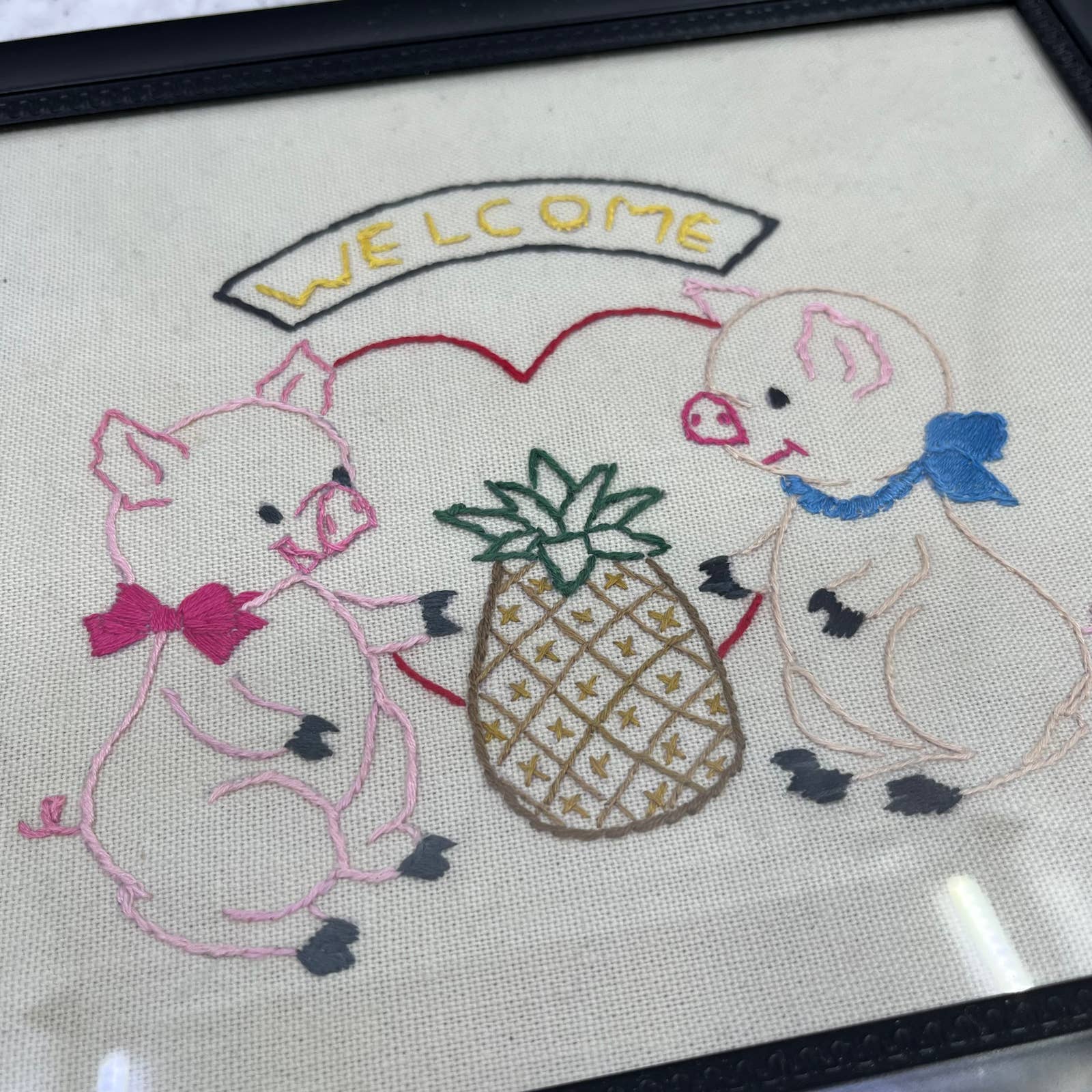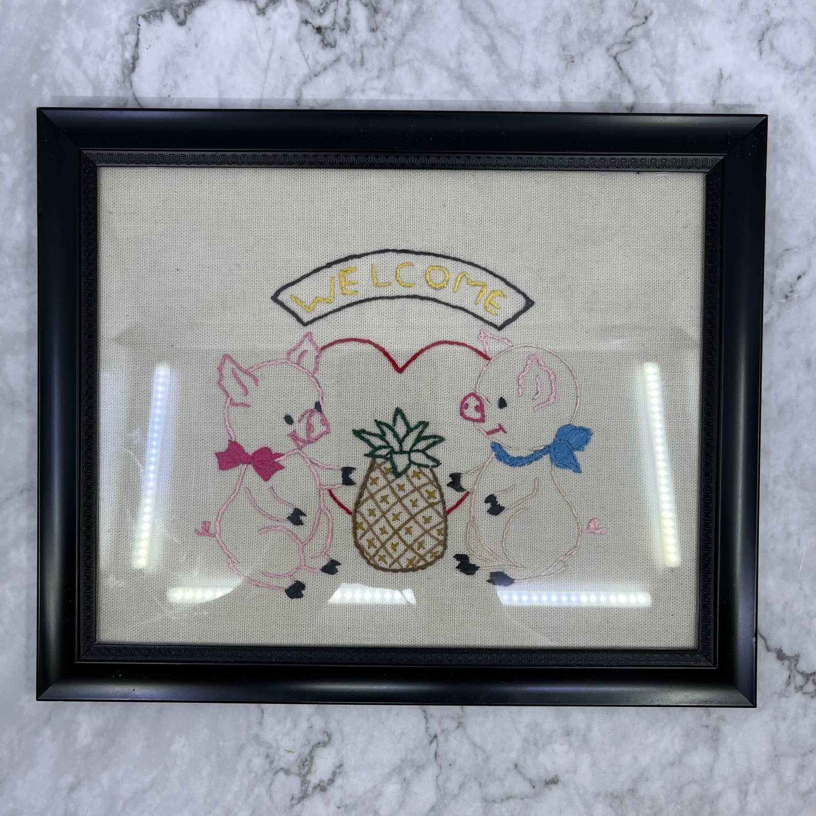 Vintage Kitschy Embroidery Wall Art WELCOME Pigs & Pineapple 9x11" TJ2