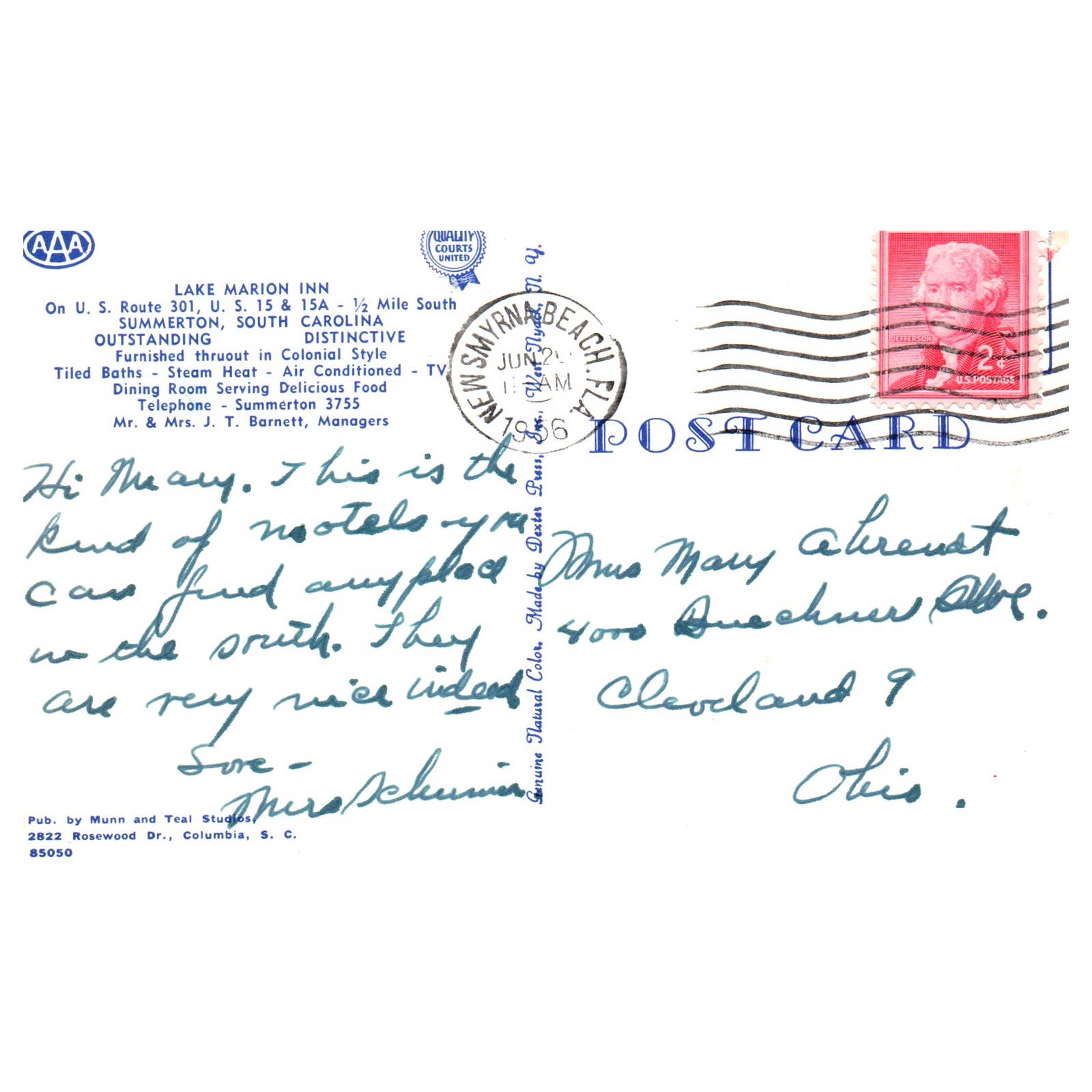 Vintage Postcard - 1956 Lake Marion Inn Summerton SC J.T. Barnett TJ7-1