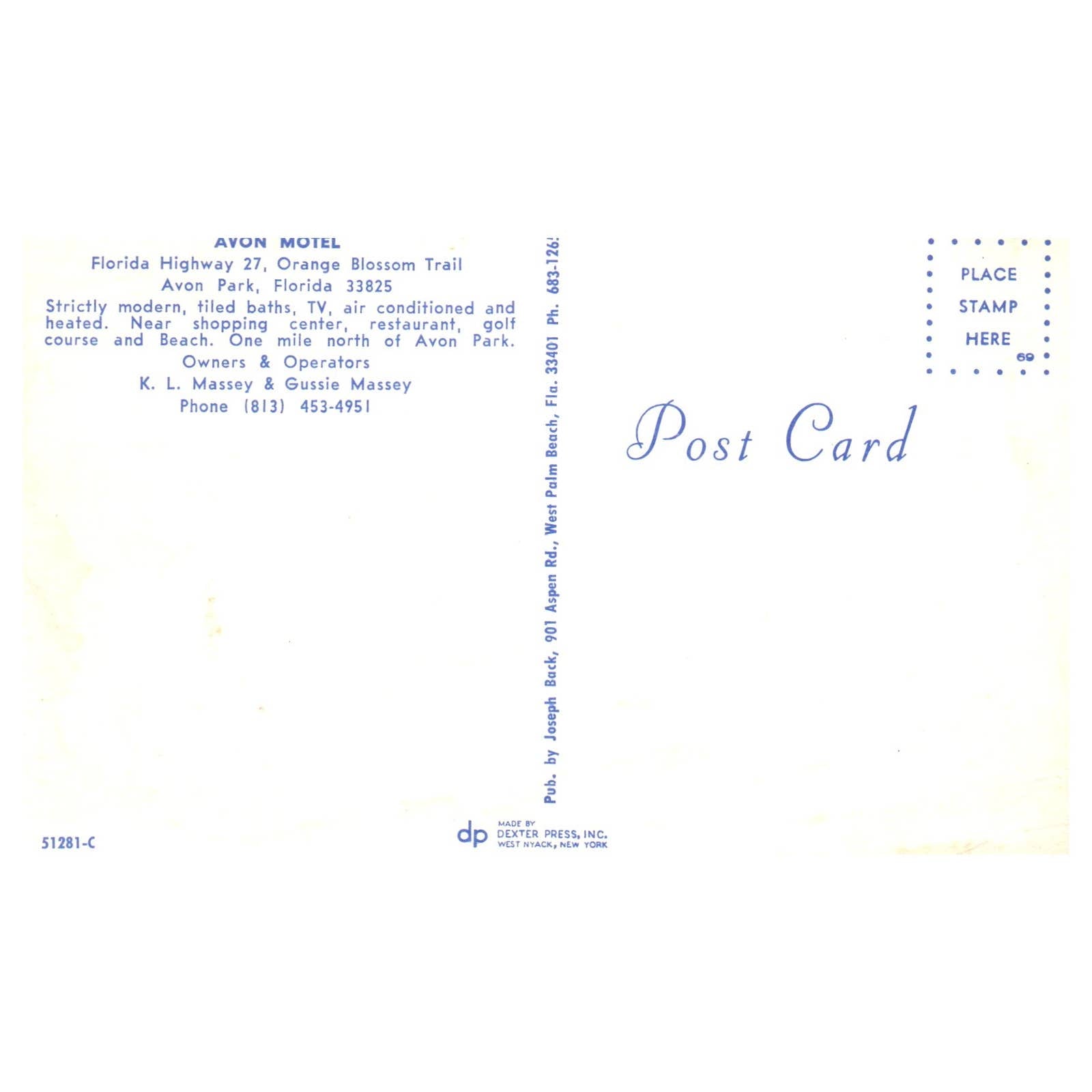 Vintage Postcard - Avon Motel Avon Park FL K.L. & Gussie Massey TJ6-1